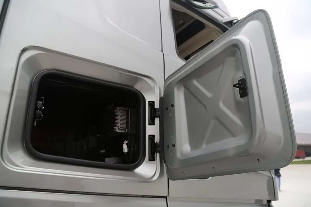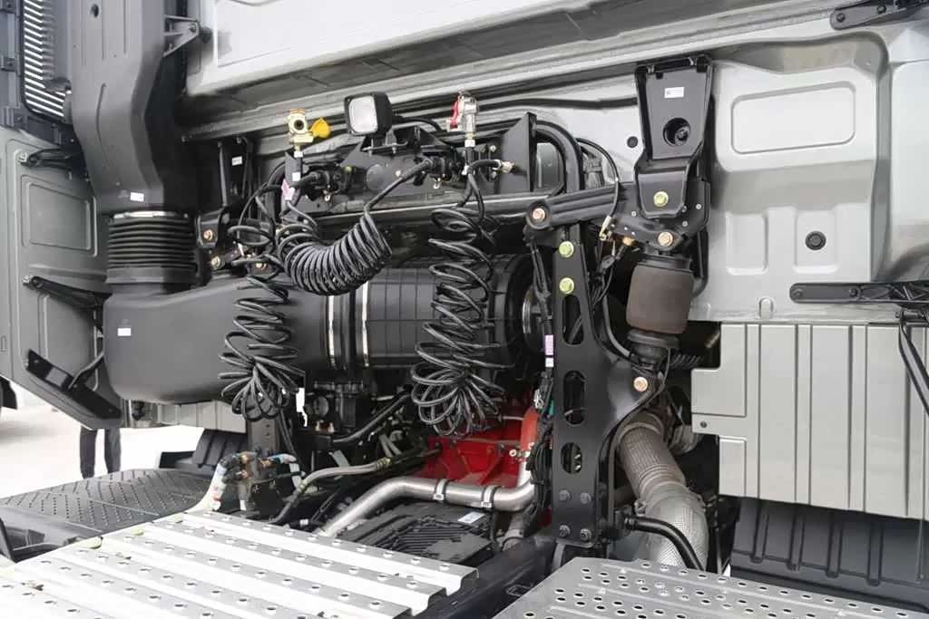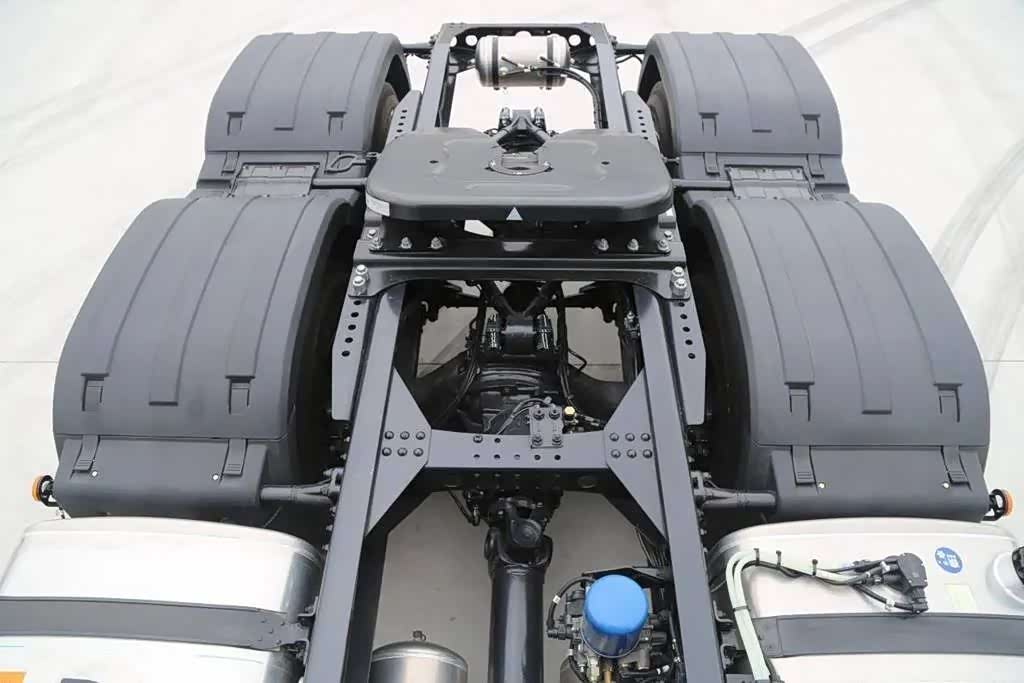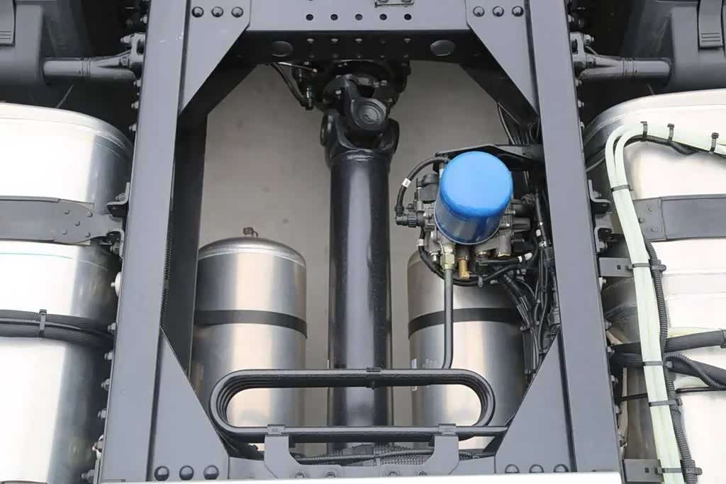 为了适应长途行车需要,复兴的车架也进行了精心的布置。车架左侧布置的是蓄电池舱、尿素箱和油箱,右侧布置的是尾气后处理装置和油箱。两个铝合金油箱容积高达1050L,带来出色的续航能力。