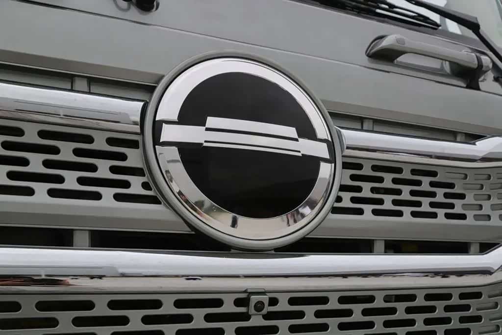 北京重卡全新车标中间的长横线代表着高质量发展,上下两端短横线意为高效率与低成本,外部环绕着象征复兴光辉的圆环。在车标的下方设有前照摄像头。