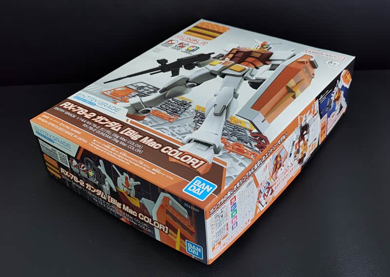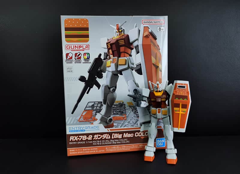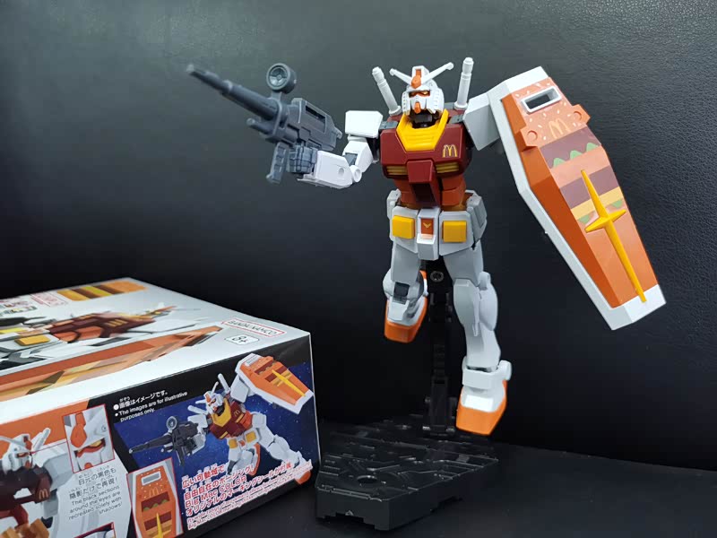 巨无霸经典的“棕、橙、黄、绿”配色,加上胸前和盾牌上的M标识,和麦当劳还是很搭的。四肢和头部都是可以活动的,也可以搭配机枪和盾牌摆造型。除去武器的巨无霸高达身高13cm,宽度5cm,重量为39.8g,大小和一个成年男人手掌相当。