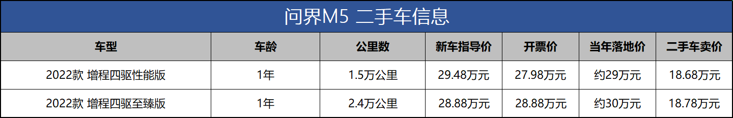 不过需要注意的是,从目前国内大环境来看,新能源汽车的残值率普遍是这个水平,2年残值一半的产品比比皆是,因此问界M5二手车一年残值10万元其实算是正常水平。当然了,这也于后期全面升级的2023款问界M5的上市有直接的关系。