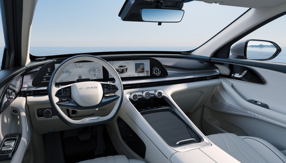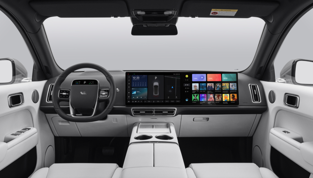 横亘中控台的巨幅屏幕,配合下方倾斜纵置的中控屏,在液晶屏的总面积上非常激进,但也很好控制了这些屏幕和座舱的融合,做到了30万级产品应有的美感和高级感。