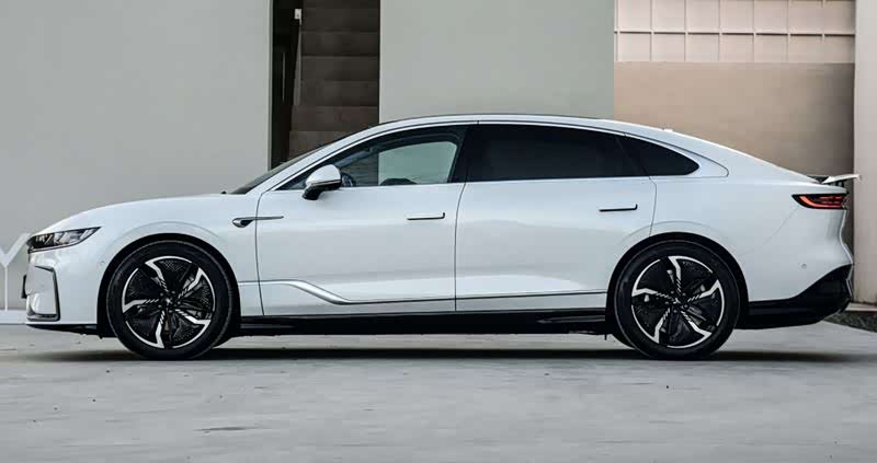 新车侧面,看起来很修长。新车长5088mm、轴距达到3000mm,隐藏式门把手,下方阶梯式线条点缀又多了一丝运动感,而且整车配备低风阻轮圈,风阻系数仅为0.225Cd达到跑车的水准,这点还是很厉害。