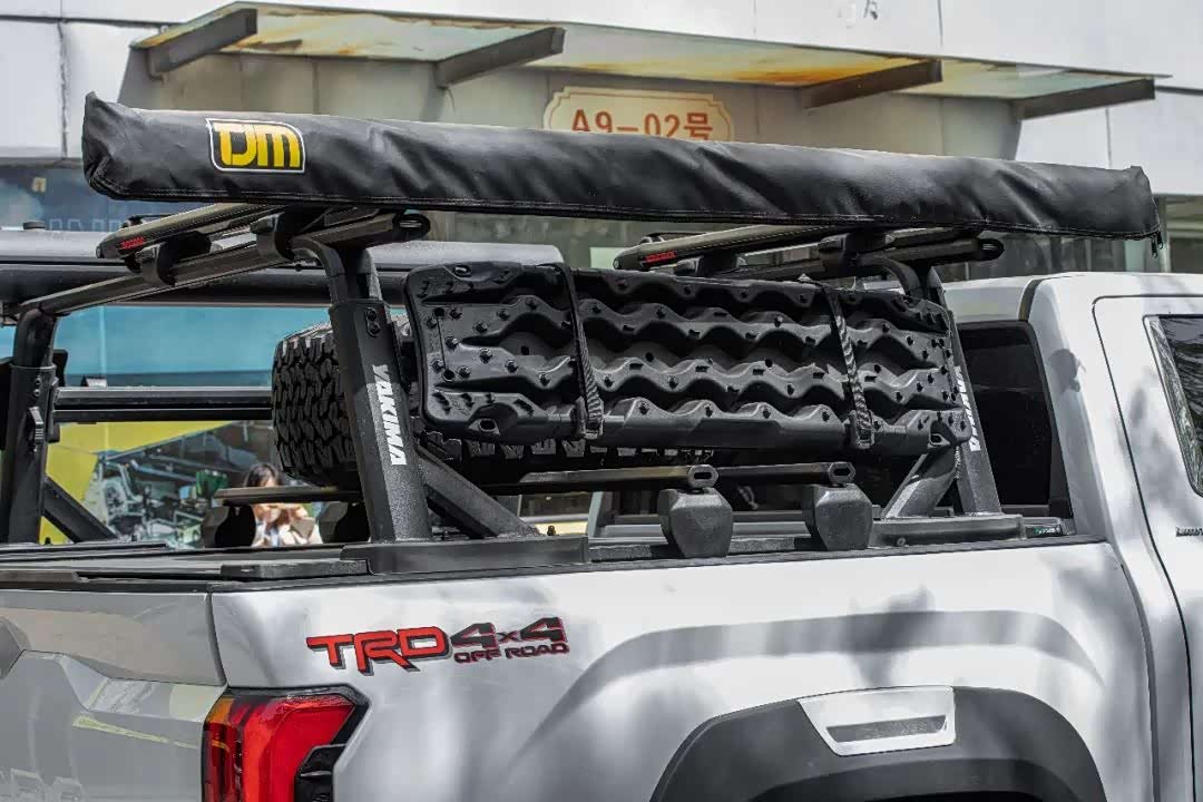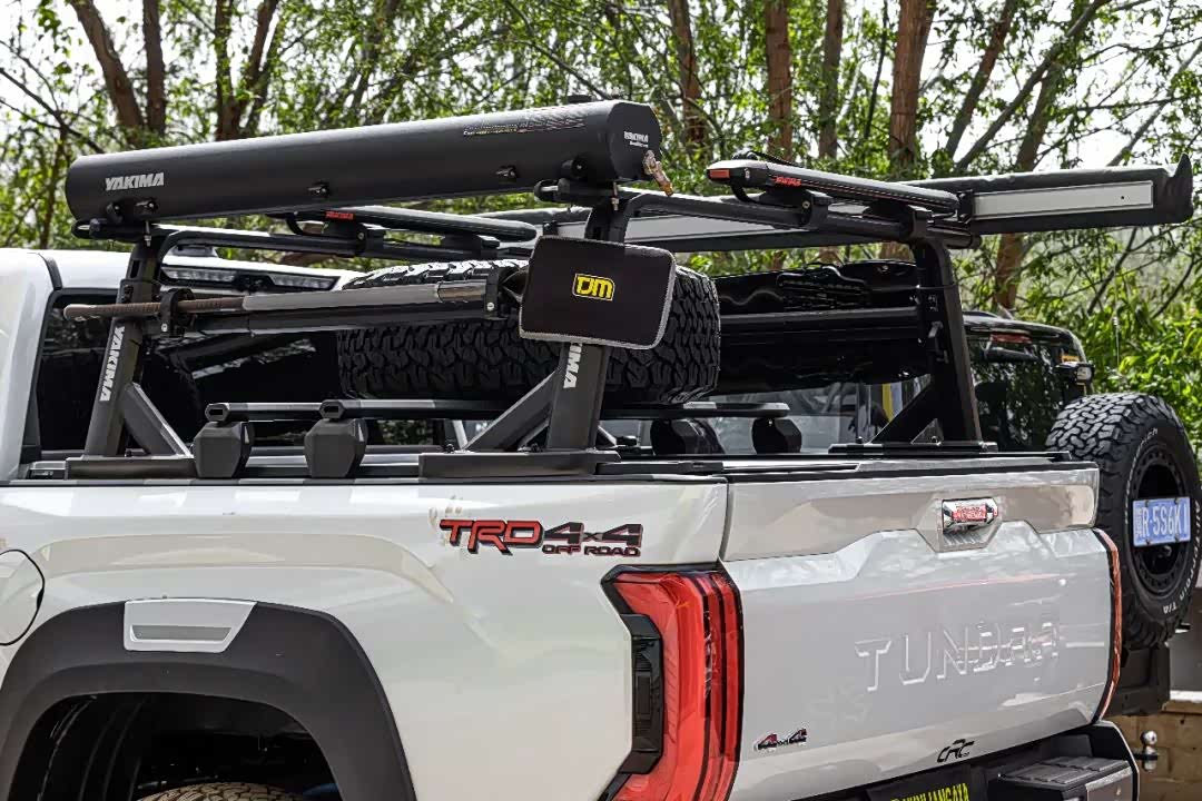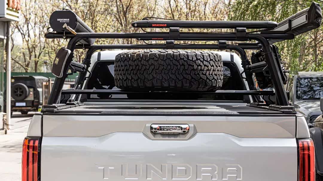 最后,在后尾厢部分,案例车还安装了一套YAKIMA拓展平台,这一平台可用于收纳户外水箱、侧边帐篷、备胎以及救援工具等物品,且不会占用原有的储物空间,极大提升了车辆的装载能力与拓展能力。