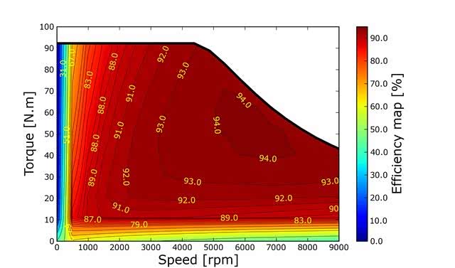 上图是一个电动机的效率图,颜色越红代表效率越高,这效率与发动机相比简直是逆天般的存在,几乎整个图都是红的,说明电机高效率区间太广了。