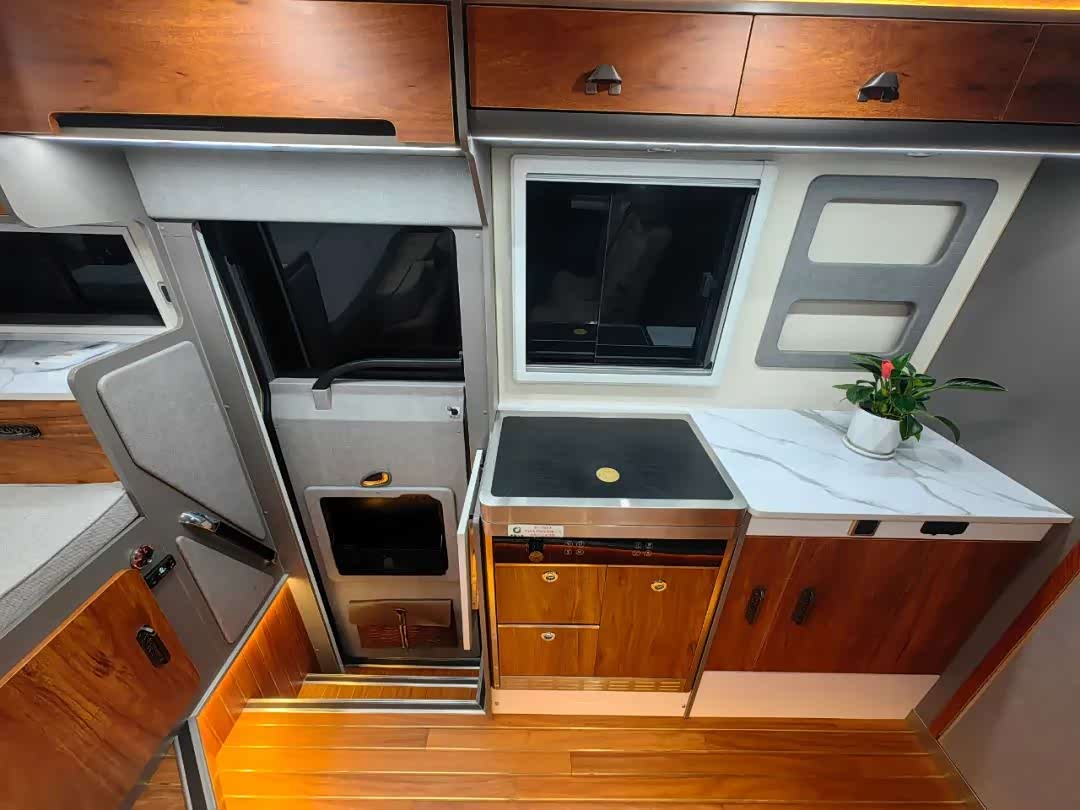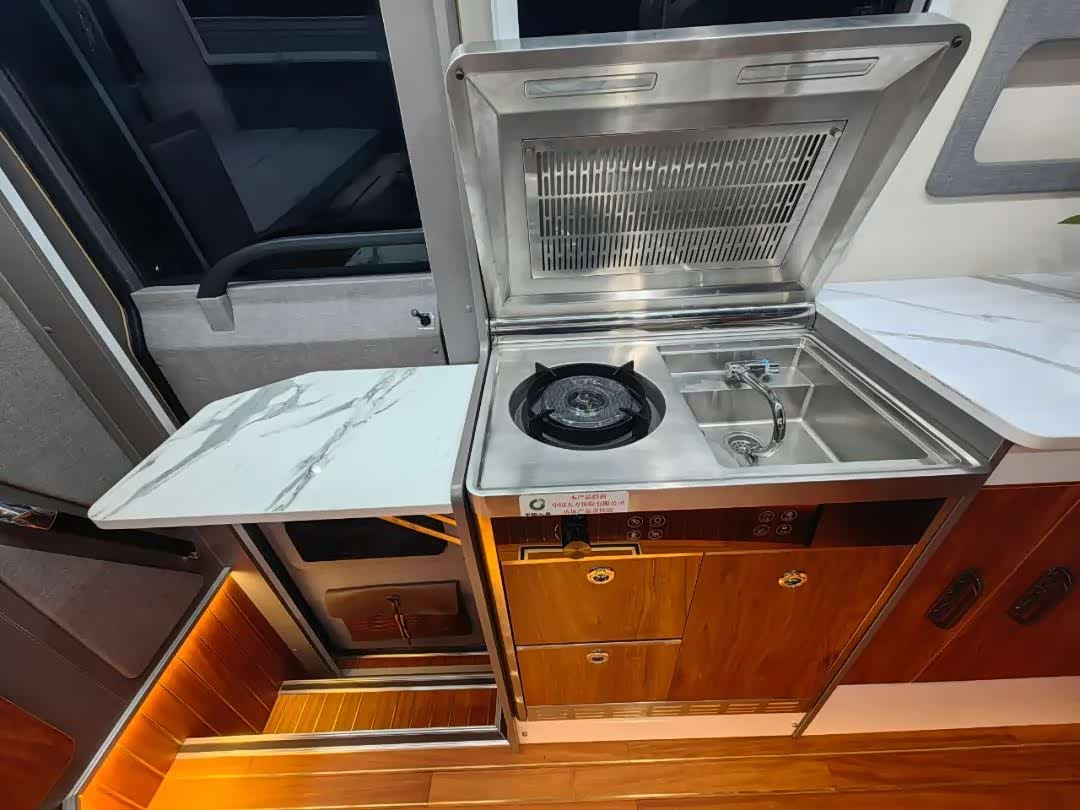 房车专用集成灶采用高质量不锈钢制作,耐高温、易清洗、智能控制火焰大小和安全保护等功能。集成灶右边配不锈钢洗手池,下方设有两个消毒碗柜。