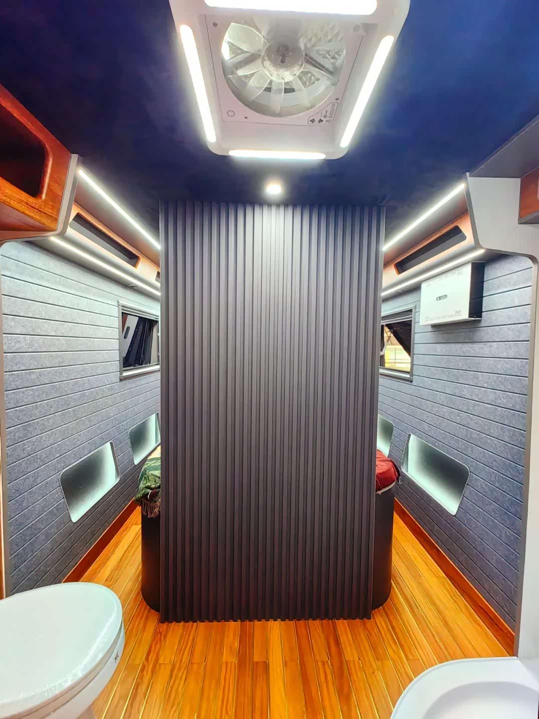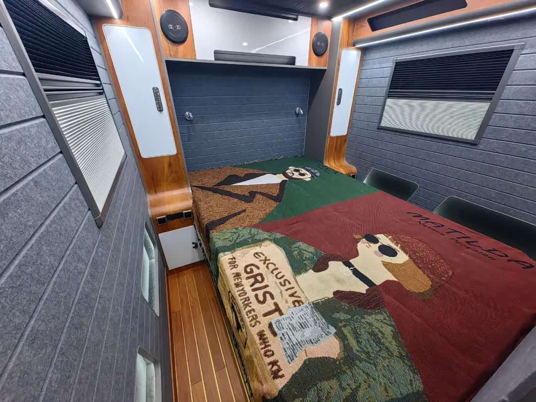 车内还配备了两侧衣柜,随时满足你的存储需求,同时还可将物品有序收纳。床头还配有12V和220V插座,提供多电源支持,方便你随时充电使用设备。
