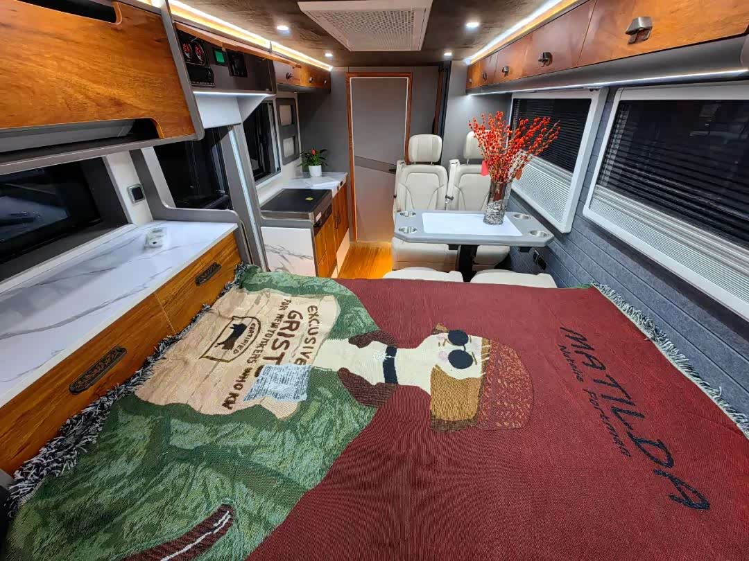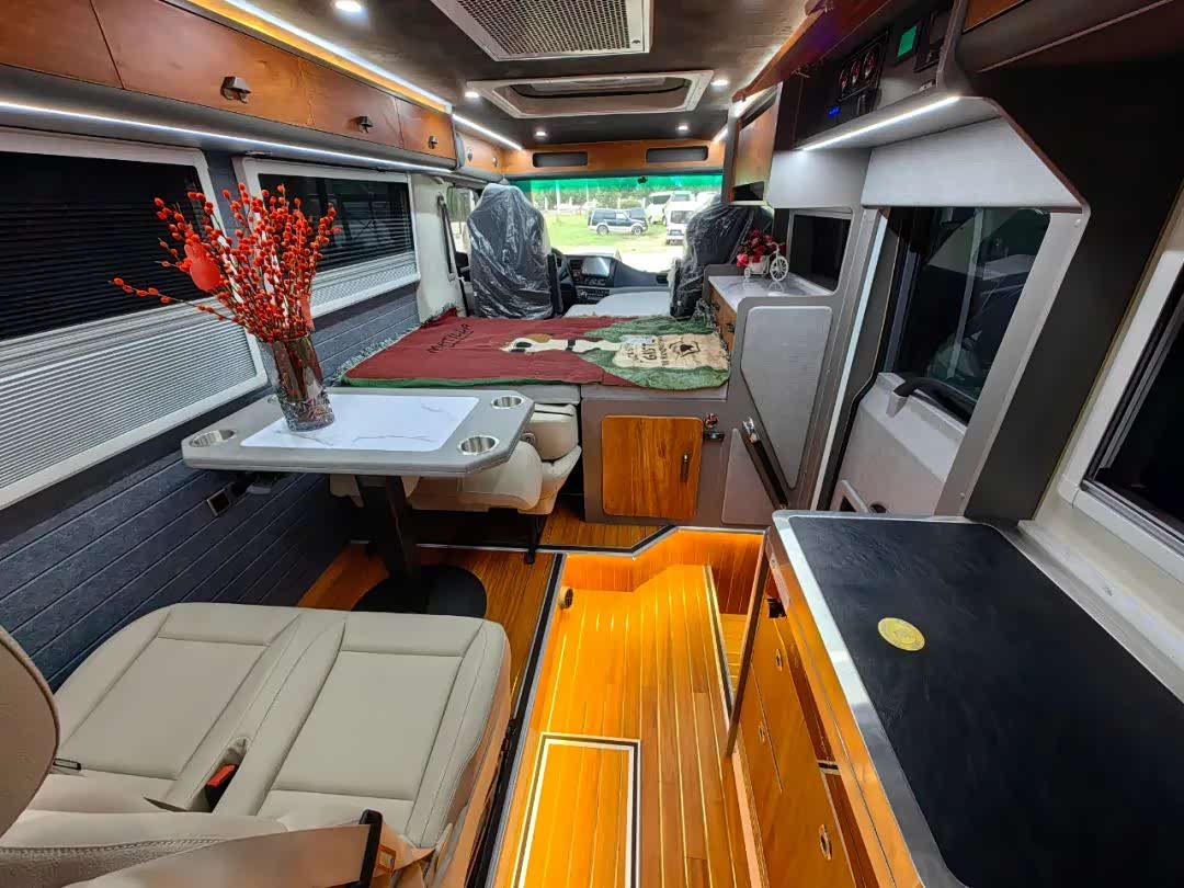 这款功能强大的霸王龙6X6越野房车,配备奔驰商务座椅,并且连接主副驾后方及利用奔驰座椅和发动机盖的空间,在需要的时候可秒变一张双人大床。床尾部还配备一个平台,使它成为一个非常实用的办公平台或孩子学习书桌。上方配有一个家用变频空调,可快速降低温度,并提供最佳的睡眠体验。