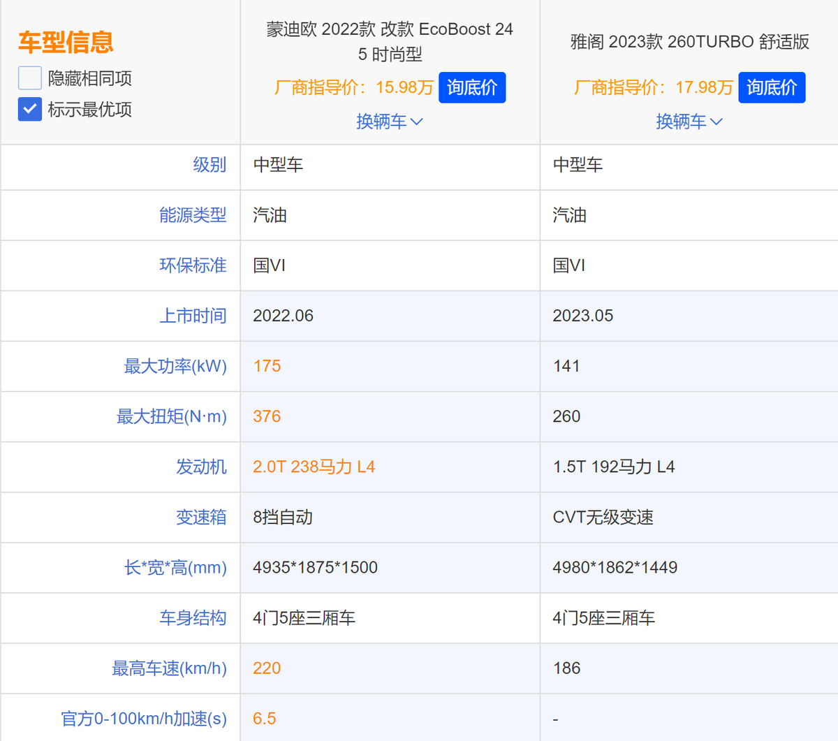 我们分别挑选两款产品最入门的车型来看看。下图表格是两者基本参数情况,新一代蒙迪欧时尚型仅需15.98万元,而雅阁要贵2万元,明显新一代蒙迪欧性价比要更高。