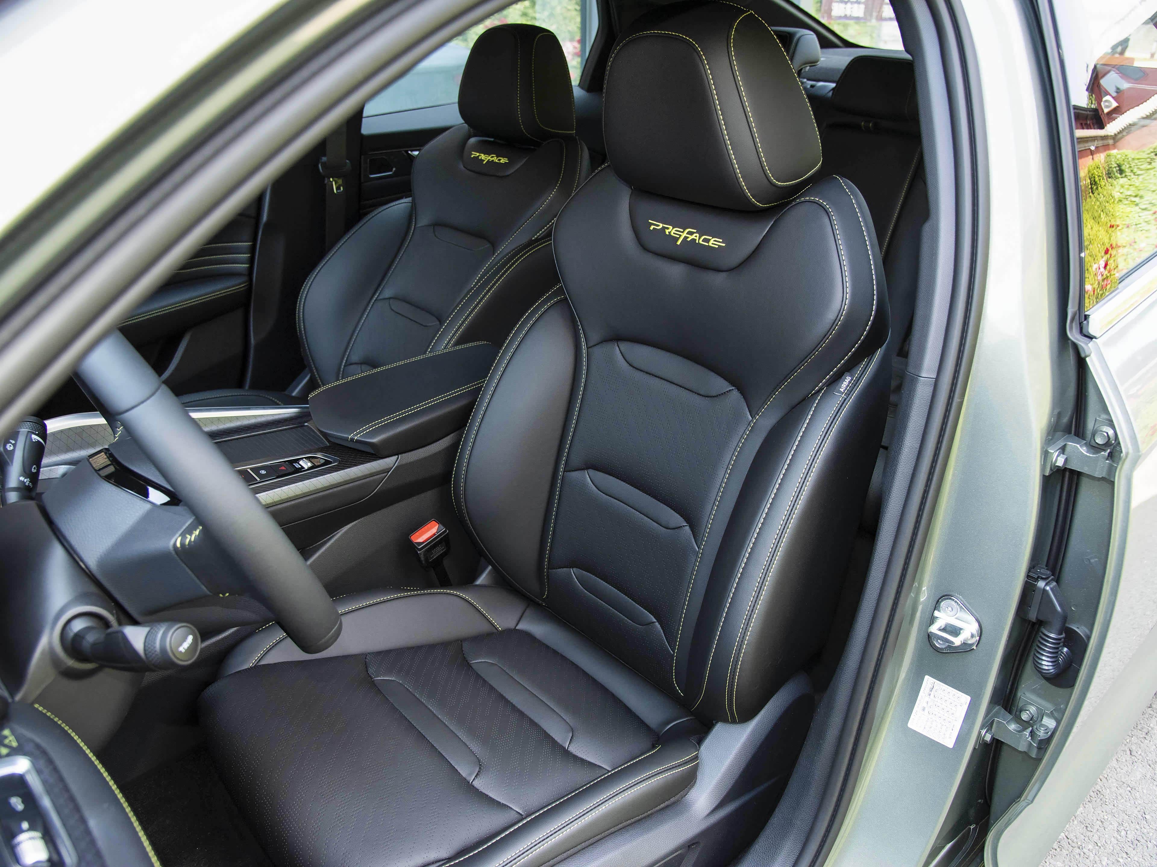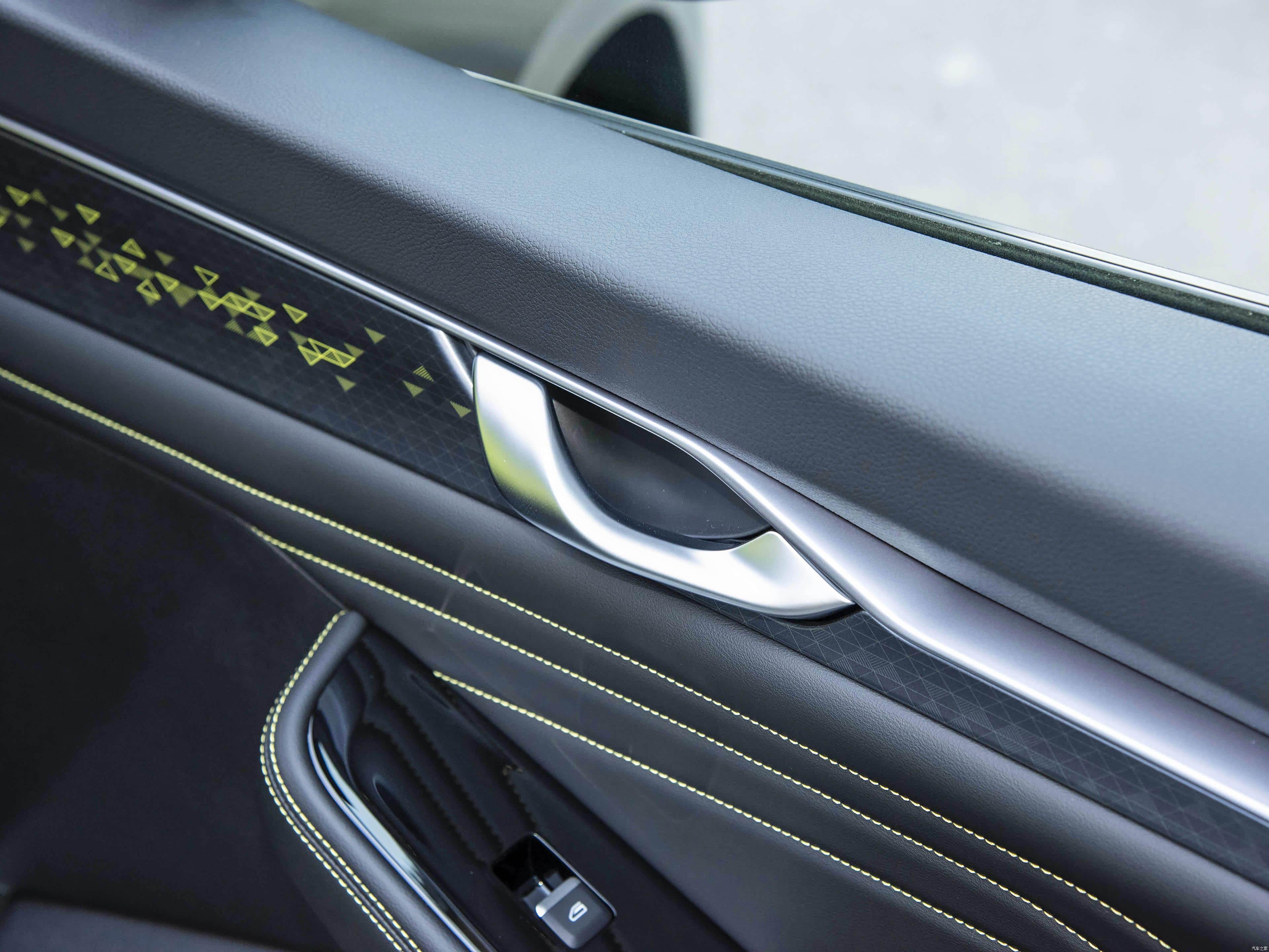 不仅如此,车内细节的拿捏也很到位。在扶摇版的内饰饰板中使用了星河镭雕3D工艺而成的三棱镜状的纹路,该纹路的灵感来源于一束光照在棱镜晶体上不断折射、发散,形成错落有致的三棱镜状的光影。此外,车内的饰板采用了质感细腻的黑色软皮包覆,再加上位于扶手箱、座椅、车门等地方的绿色缝线,使其十分讨好视觉和触觉感官,从而打造出了扶摇版的专属内饰效果。