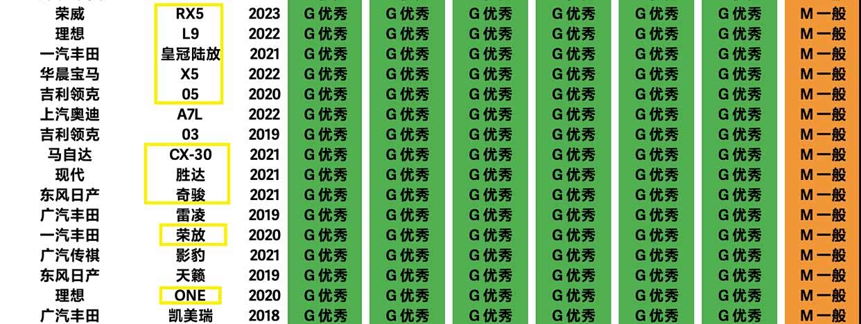 再来看下排名中游的SUV车型,国产车荣威RX5、理想L9和领克05的碰撞测试成绩都比较理想,荣威RX5测试的是2023款车型,可参考性还是非常高的,理想L9也是目前最受欢迎的大型SUV,月均销量接近7千辆大关。品质不错的皇冠陆放、宝马X5、丰田RAV4荣放以及日产奇骏等车型,主驾25%碰撞测试以及车身侧面碰撞测试也都顺利通过。而马自达CX-30、现代胜达以及理想ONE等车型,碰撞测试成绩也都在入榜前30位。