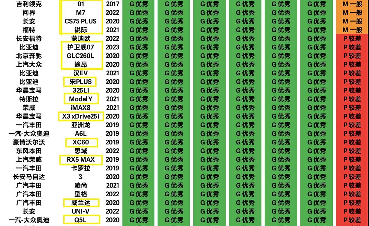 最后,六项测试全部获得G级的SUV车型还有:问界M7、长安CS75 PLUS、护卫舰 07以及比亚迪宋PLUS等国产车型,也包含奔驰GLC、大众途昂、特斯拉Model Y、宝马X3、丰田威兰达以及奥迪Q5L等合资SUV,三大德系豪华中型SUV和特斯拉Model Y,月均销量都在万辆以上,它们的碰撞测试成绩也非常理想。