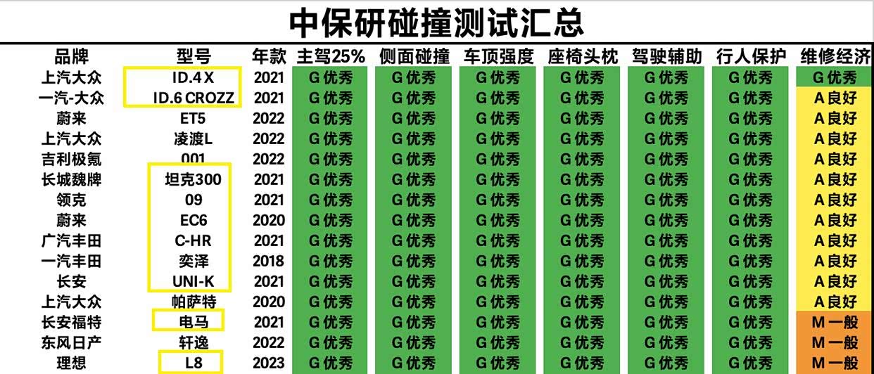 导读:对于喜欢SUV车型的消费者来说,买车时除了要注意一下它们的经济性和稳定性之外,对于它们的安全碰撞测试成绩也应该了解一下。而本期内容就依据中保研发布的碰撞测试成绩,来给大家分享一下SUV碰撞成绩TOP30!具体来看,上汽大众和一汽大众旗下的两款新能源SUV夺得冠亚军,而国产车 坦克300(参数|询价)、领克09、长安UNI-K和理想L8等车型,碰撞测试成绩也都是名列前茅。主流车型丰田RAV4荣放、奔驰GLC、特斯拉Model Y、宝马X3以及丰田威兰达等车型,碰撞测试成绩也都全部获得G级。买SUV需慎重!中保研碰撞成绩TOP30:坦克300前10,GLC威兰达上榜!