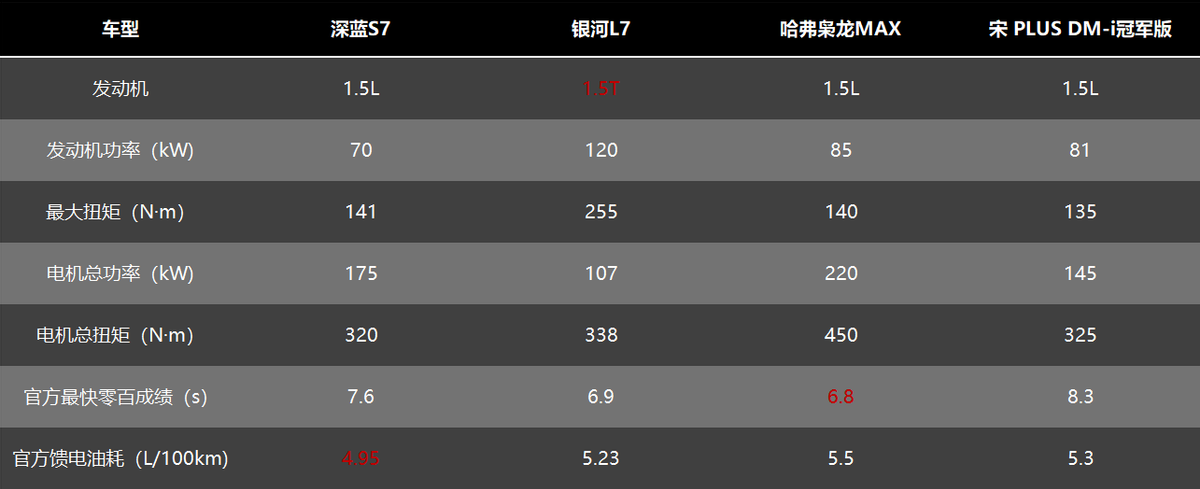 一是深蓝S7,采用的是增程技术,搭载了1.5L四缸增程器,主要以电驱动为主,城区道路开起来是最接近电车的驾驶体感的,官方最快零百加速7.6秒。其他三台车都是搭载插电式混合动力,从官方零百结果来看,最快的是枭龙MAX,零百加速6.8秒,银河L7排在第二,零百加速时间6.9秒,而宋PLUS DM-i冠军版最慢,其零百加速成绩仅有8.3秒。