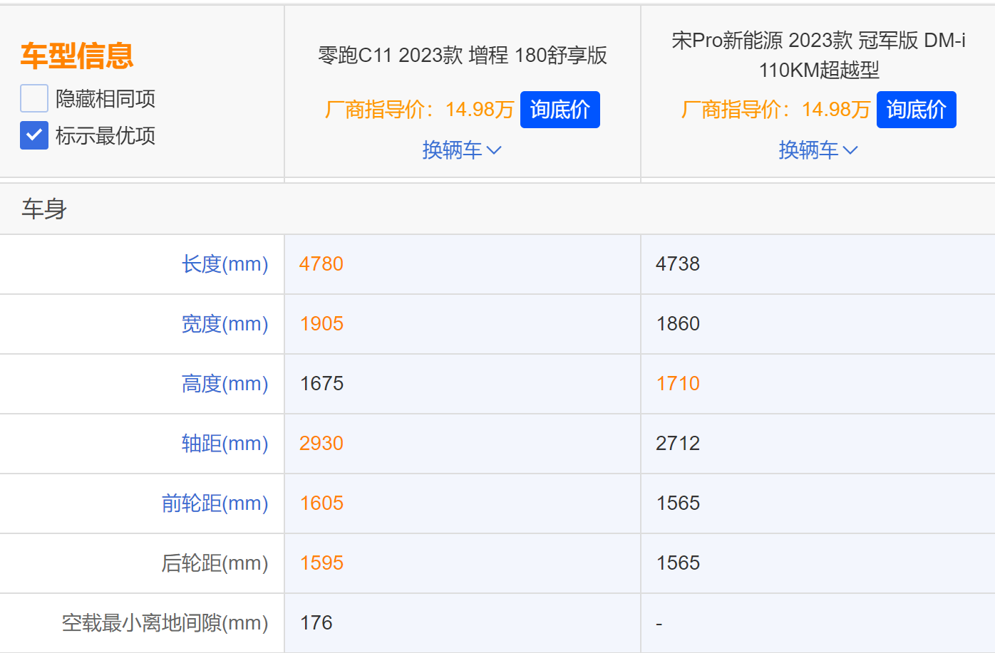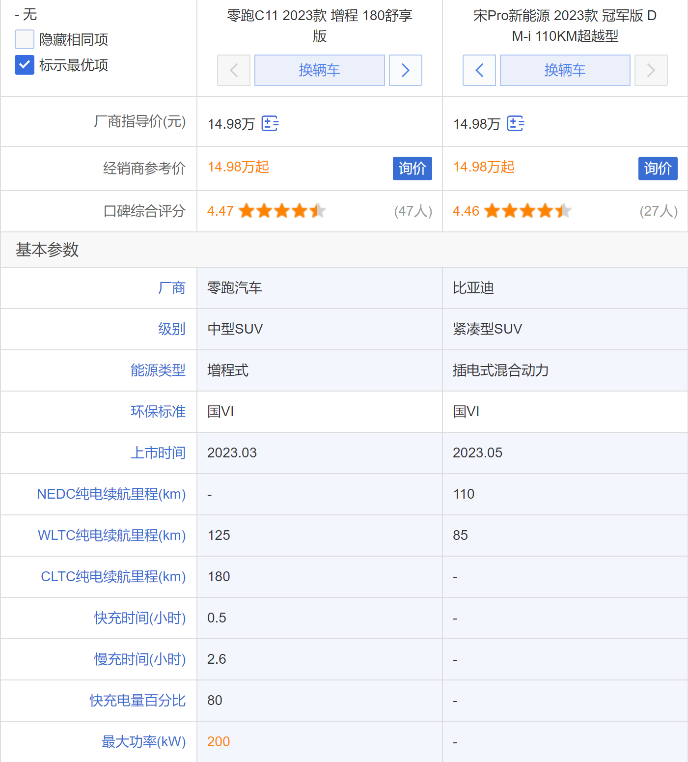 我们挑选厂商指导价格均为14.98万元的零跑C11增程180舒享版(以下简称零跑C11)和宋Pro冠军版超越型(以下简称宋Pro)来对比。首先两者综合口碑得分上,零跑C11要领先一点。我们看到虽然同价格,但零跑C11是一款中型SUV,而比亚迪宋Pro是紧凑级SUV,相比之下,零跑C11是越级的享受,整体性能势必会更强。