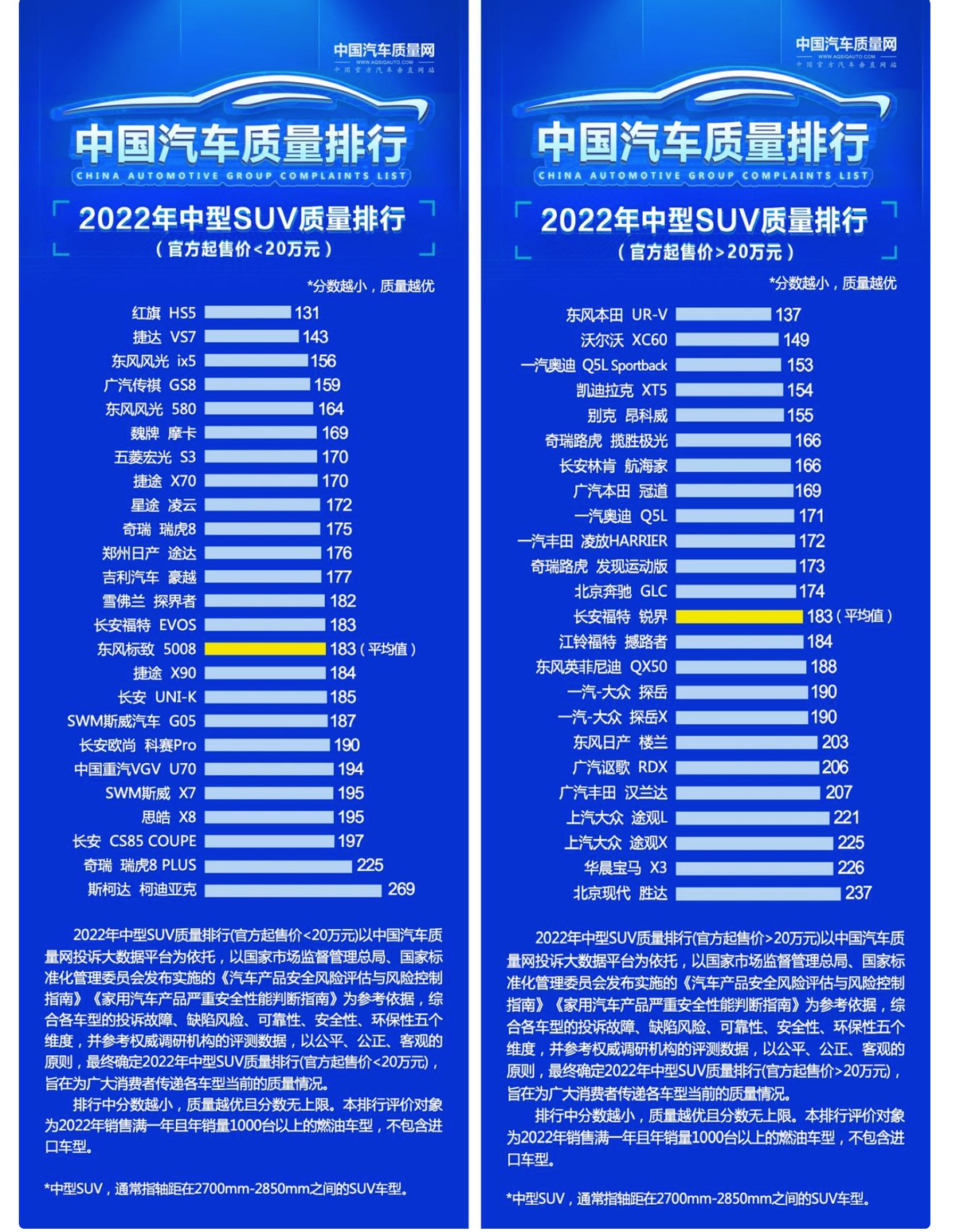 中型SUV质量榜单,质量达标率勉强达到五成