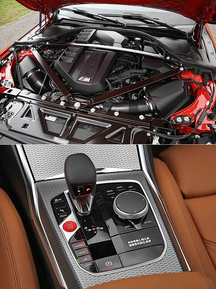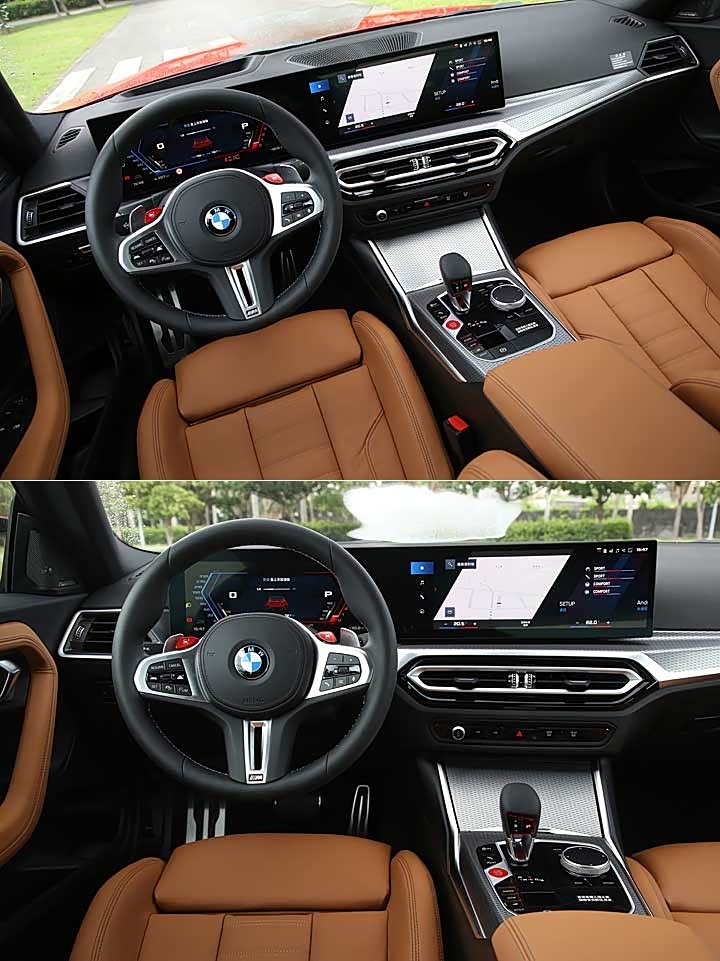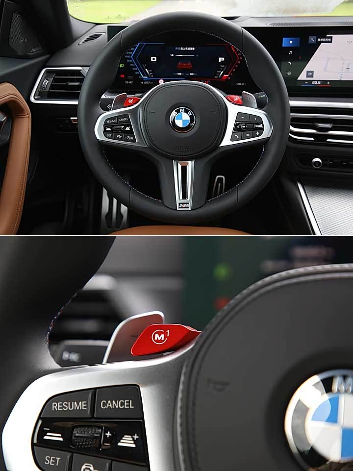 内饰部分除标配 M 车况抬头显示器,也搭载 M 缝线安全带、M 光影车门饰板、M Mode 驾驭模式切换、M SETUP 车辆动态设定等 M 专属设定,不过方向盘为 M 专属缝线真皮方向盘含换档拨片,具有 M1/M2 快捷键、还有中央的红色启动键,但标配的方向盘并没有碳纤维饰板,同样需选配 M Race Track Package 才会搭载。