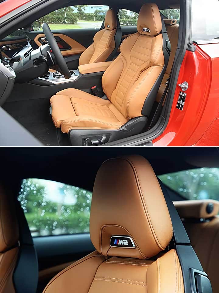 内饰部份,一如先前已更新的 2 Series Coupé,大改款 M2 换搭与小改 3 Series 相同的 12.3 吋数位仪表、14.9 吋中央触控荧幕,双荧幕为一体式相连曲面设计,并采用最新世代的 iDrive 8 系统,也将空调控制面板取消而整合在荧幕内。而大改款 M2 身为 M Power 车款的独特之处,除了配有 M 专属 HUD 抬头显示器,过往 M 车款的换档指示灯在 12.3 吋数位仪表中也以全新视觉呈现,中控 14.9 吋荧幕更可以专属的 Widgets 显示实时的轮胎状况。M 专属 HUD 抬头显示器则可显示,包含转速等动态所需信息。