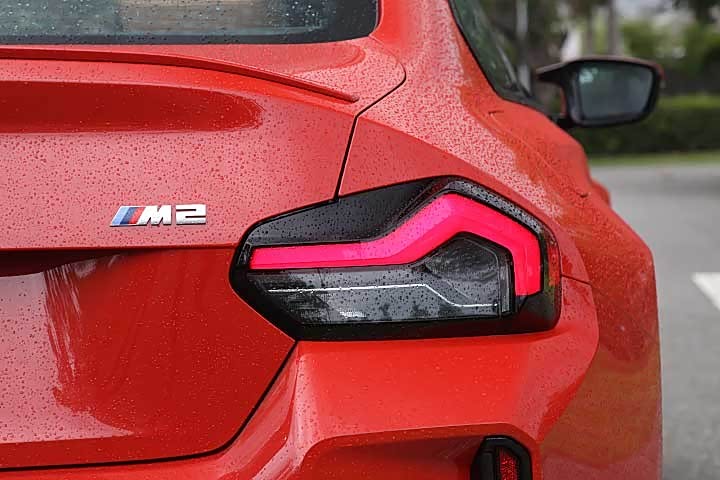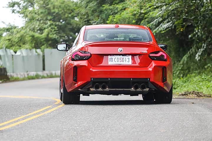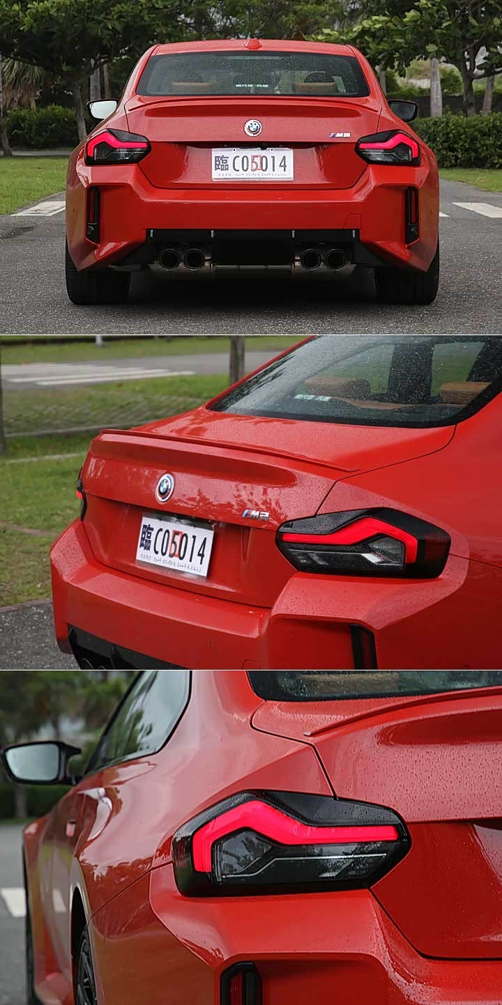 新世代 M2 也有着品牌新世代车型的平整化车门把手,并搭配无窗框车门与车尾经典的 Hofmeister kink 经典后窗摺角,足下则采用与 M3/M4 相同尺寸的前 19 吋、后 20 吋 M 双辐式 930 M 轮圈,并提供笔者试驾的黑色、或是双色选择。车尾则有向 2002 致敬的燻黑 LED 尾灯、与车头呼应的乖张后保杠造型,并有结合转属排气系统与电子阀门的四出黑色高光泽排气尾管。