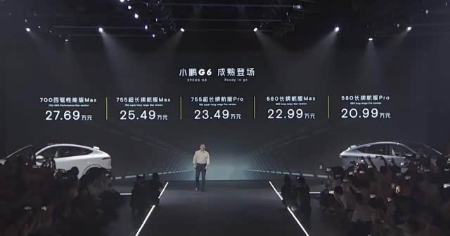 6月29日,小鹏G6宣布正式上市,新车共推出5款车型,售价区间为20.99-27.69万元。官方表示,新车基于800V架构打造,提供XNGP智能辅助驾驶系统。