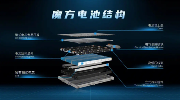 魔方电池的最大技术特点就是采用了躺式电芯的布局。通过对电芯布局的重塑,“躺平”之后的电芯能够实现超高集成度、超长寿命、“零热失控”安全防护的三大优势。