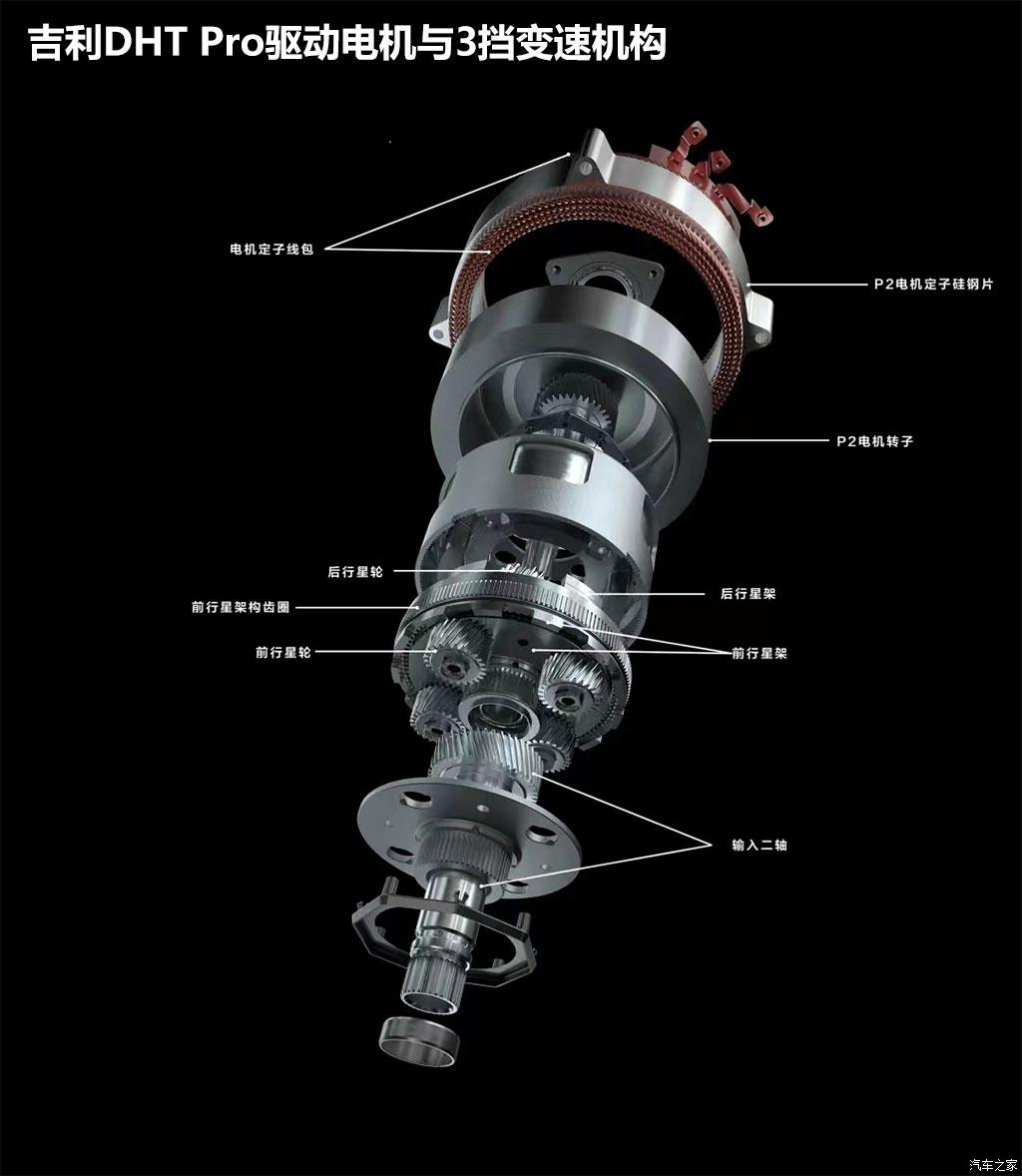 DHT三挡变速箱非常紧凑,P2电动机尺寸非常小,配有同轴行星齿轮组,完成3档变速。