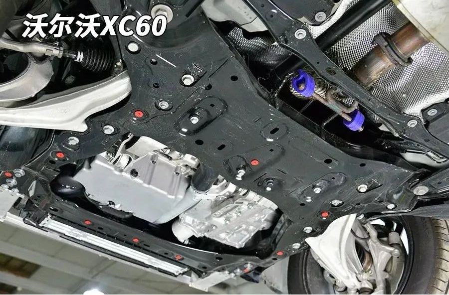 前副车架是双层冲压钢板全框式结构,布局、设计,甚至固定螺栓位置,都和汽油版领克09、沃尔沃XC60完全相同。