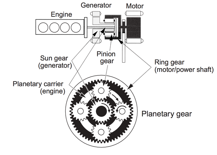 由一个外圈行星齿轮架,四个行星齿轮,以及中央输出轴的太阳轮,组成变速箱结构。看上去非常眼熟?其实这就是丰田THS混动行星齿轮组的变形。