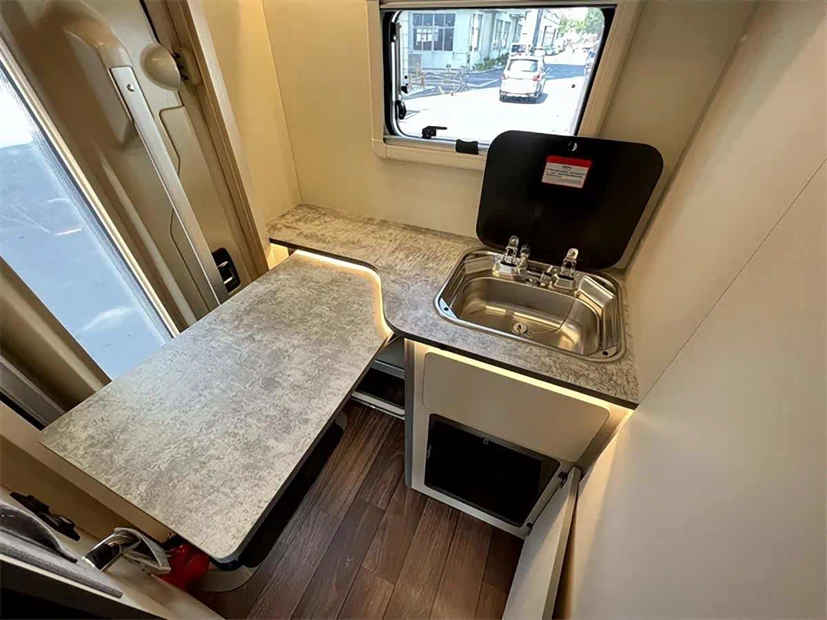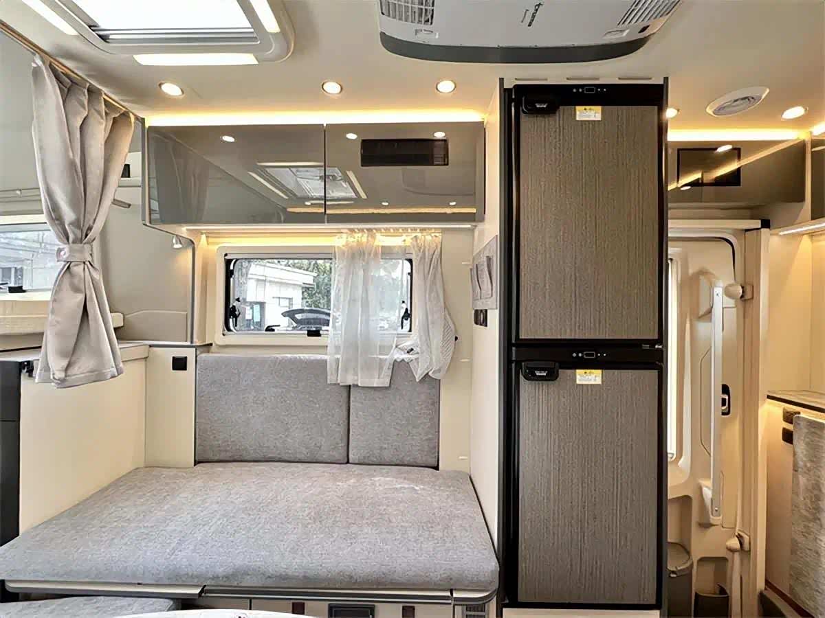 厨房区域在车的尾部,使用L型的操作台,操作空间相对于其他房车来说宽敞了许多。台面上安装了电磁炉和带盖水槽以及折叠水龙头,满足日常在室内烹饪的需求。在操作台侧边有一个组合柜,安装了微波炉和房车专用85L冰箱,觉得冰箱不够大的车友可以选择安装152L的冰箱。操作台下方和上方则全是存放厨房用品的柜子,让您烹饪不受约束。