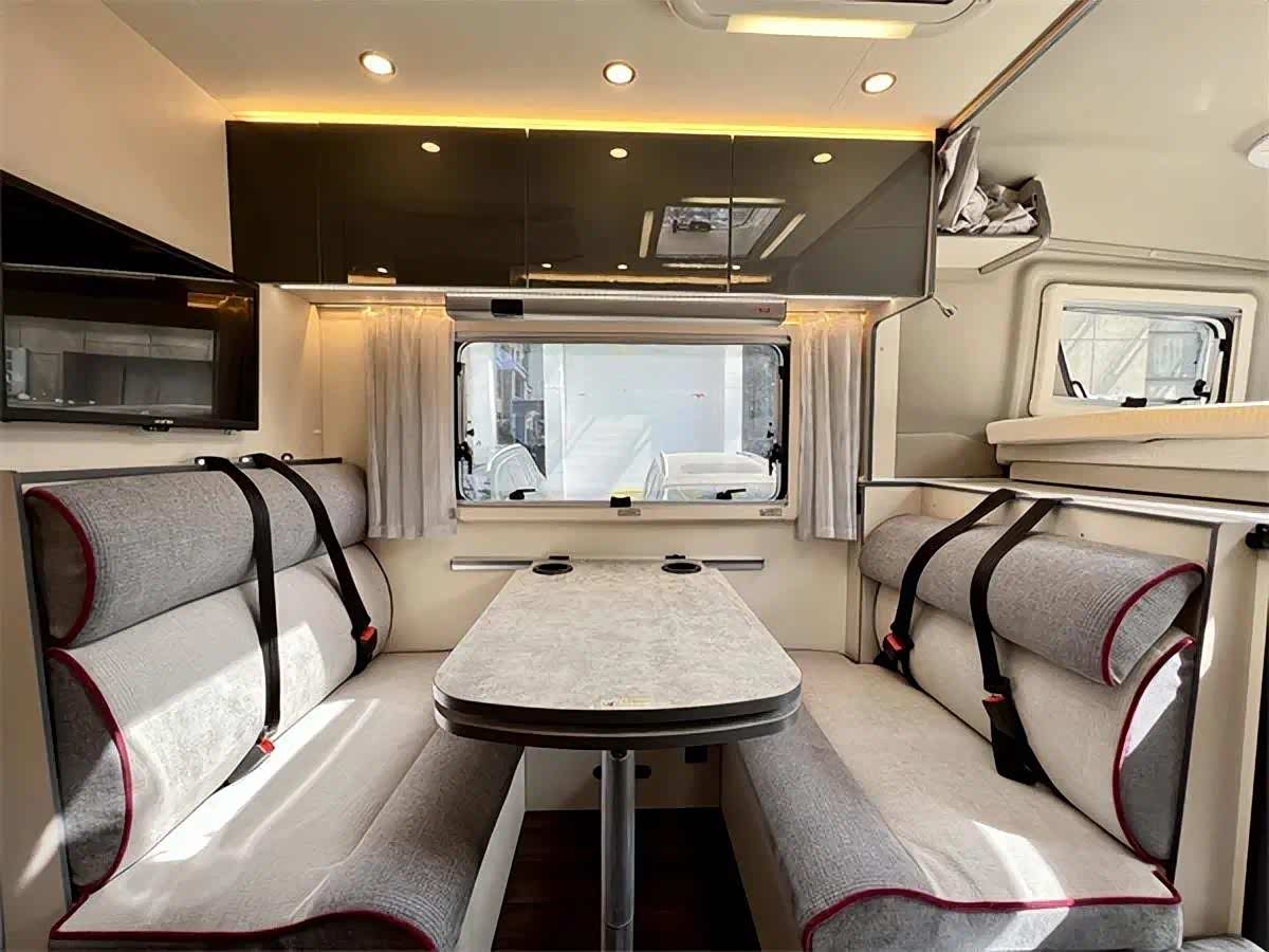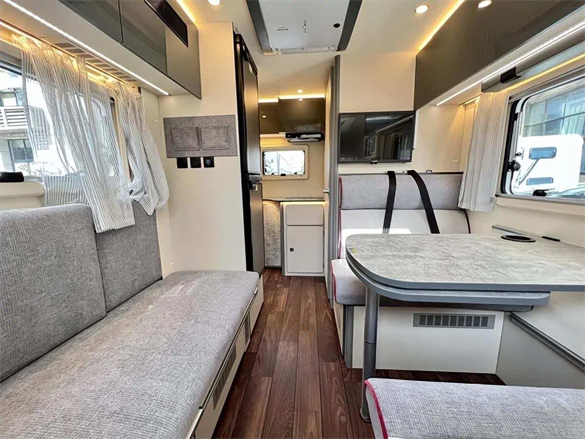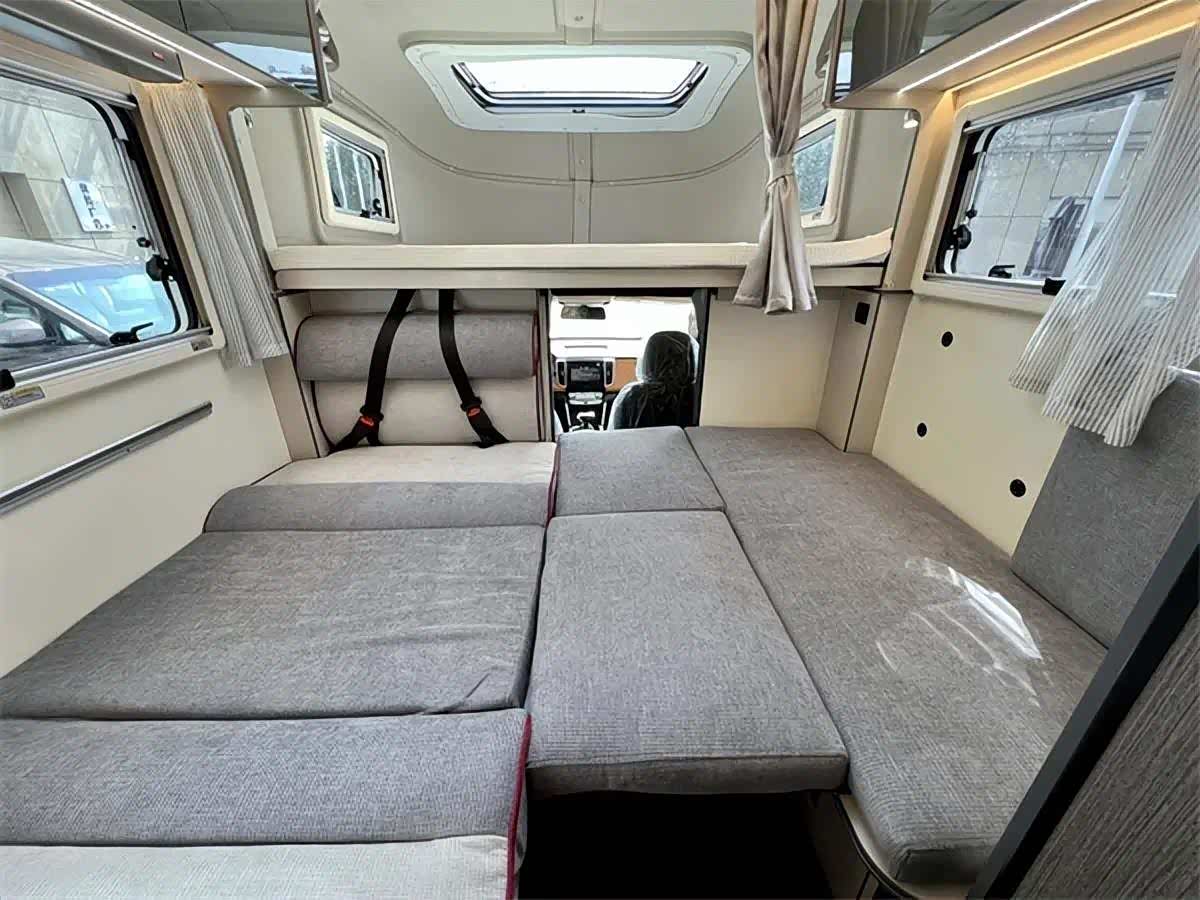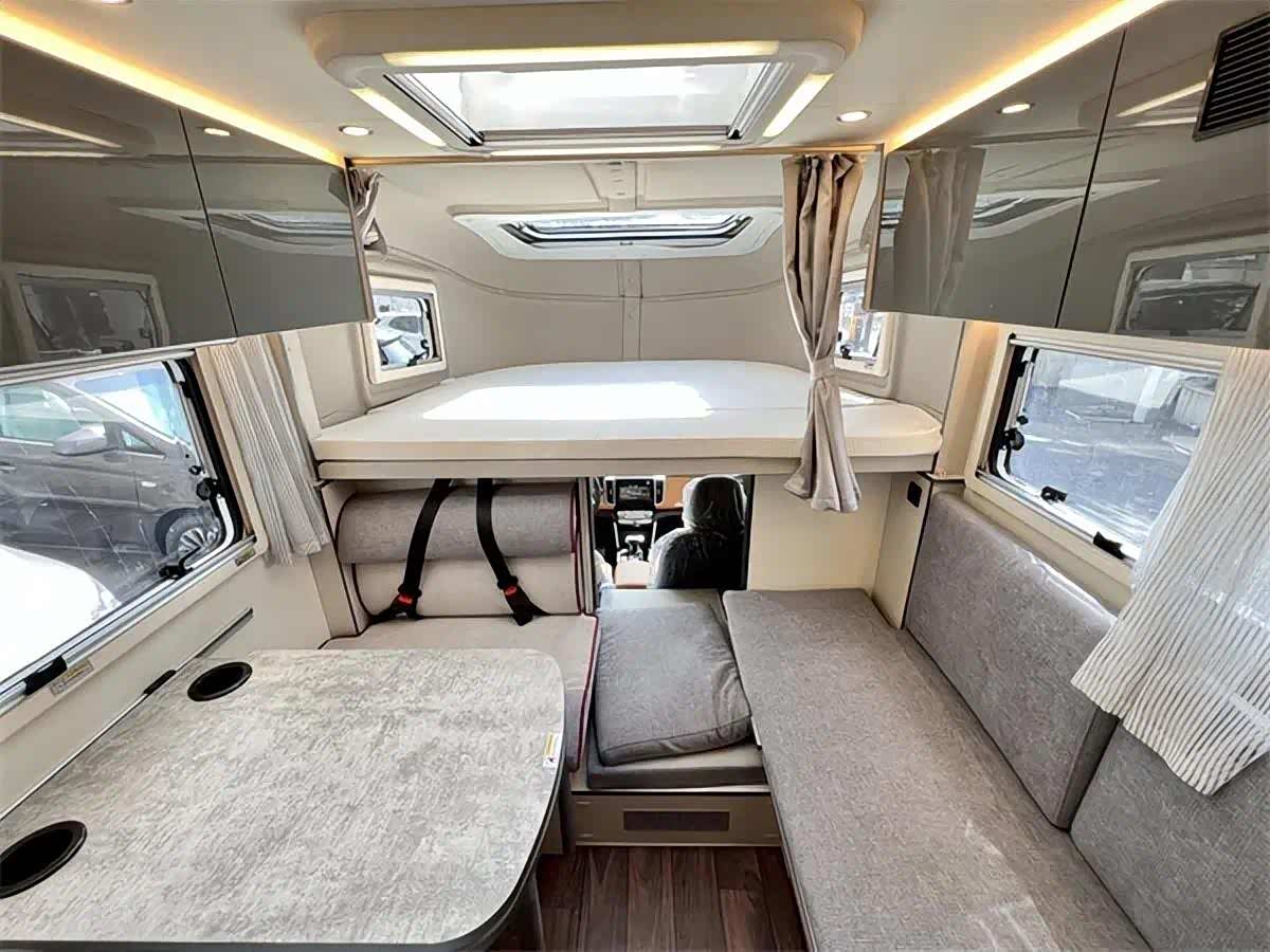 车厢内部整体采用亮面白色板材,清爽简洁,光线感更加充足;整车借鉴了苏州园林的设计理念,相较于同级别的房车,空间利用率得到了最大限度地提升。得益于后上门的设计,车内整体布局非常合理,可以说达到了最大化的空间利用。会客区域的软包包覆座椅,搭配四周的氛围灯带,温馨至极,能够带给出行者如同在家中一般的温馨舒适感。
