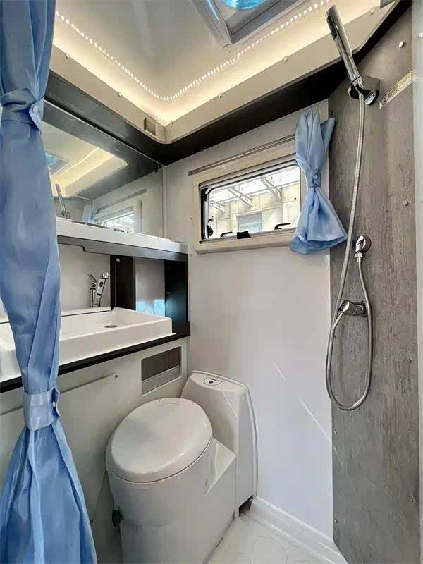 干湿一体式卫浴间内配置有折叠式水盆,提升了内部的空间感,此外区域内还配置有固定坐便器、独立淋浴花洒、换气扇、毛巾架、卫浴镜等,用户可以选装洗衣机,实现轻松旅居。
