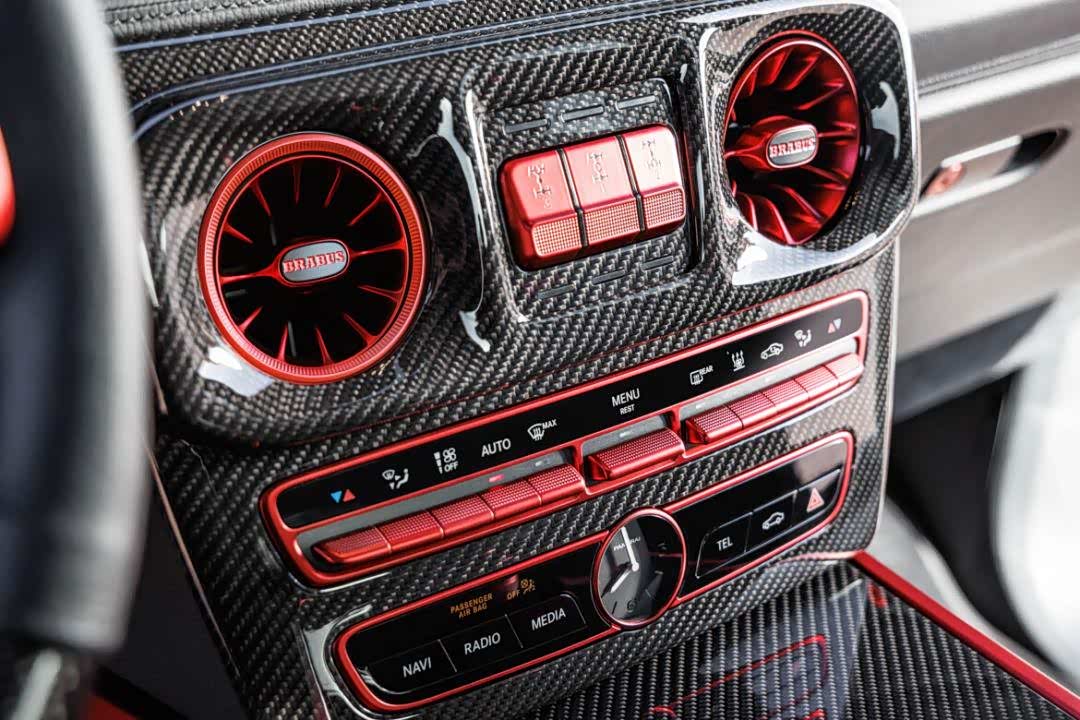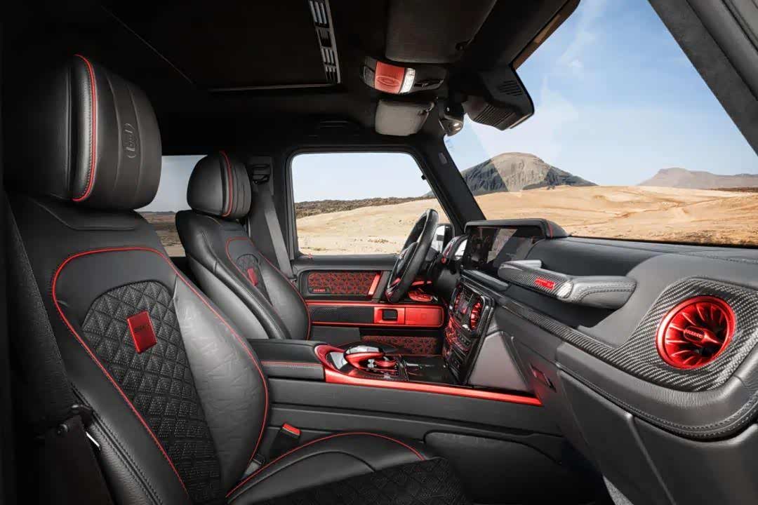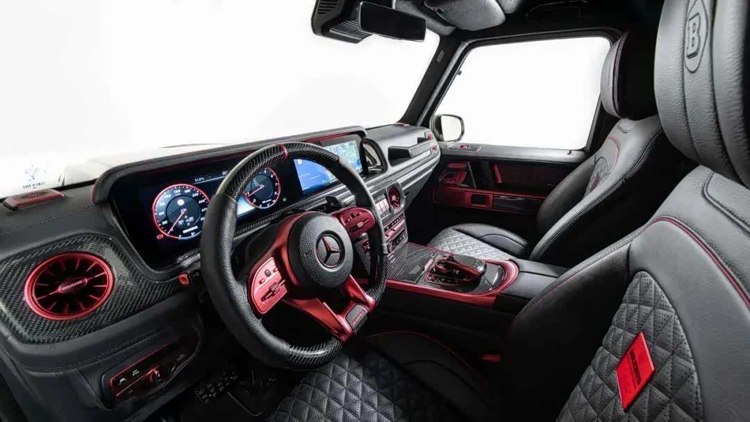 内饰方面,采用了红黑搭配,材质方面大量采用真皮以及碳纤维饰板进行装饰,座椅做工也相当复杂,中间有菱形缝线和打孔工艺,头枕有压印的BRABUS徽标。内饰还印着很多“77”字样的浮雕,这是在向BRABUS的创始年份——1977年致敬。