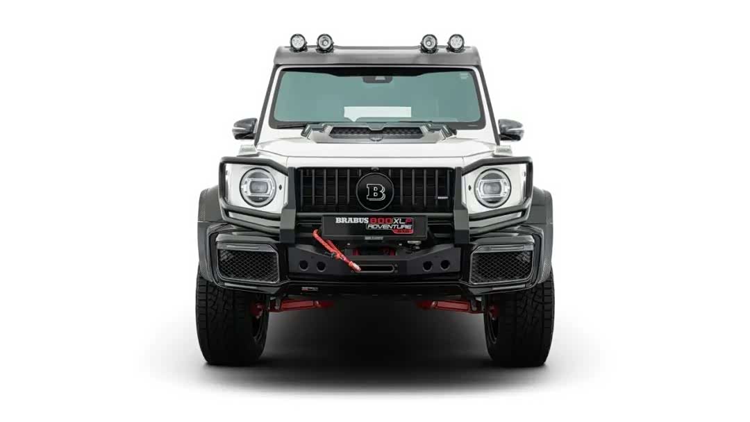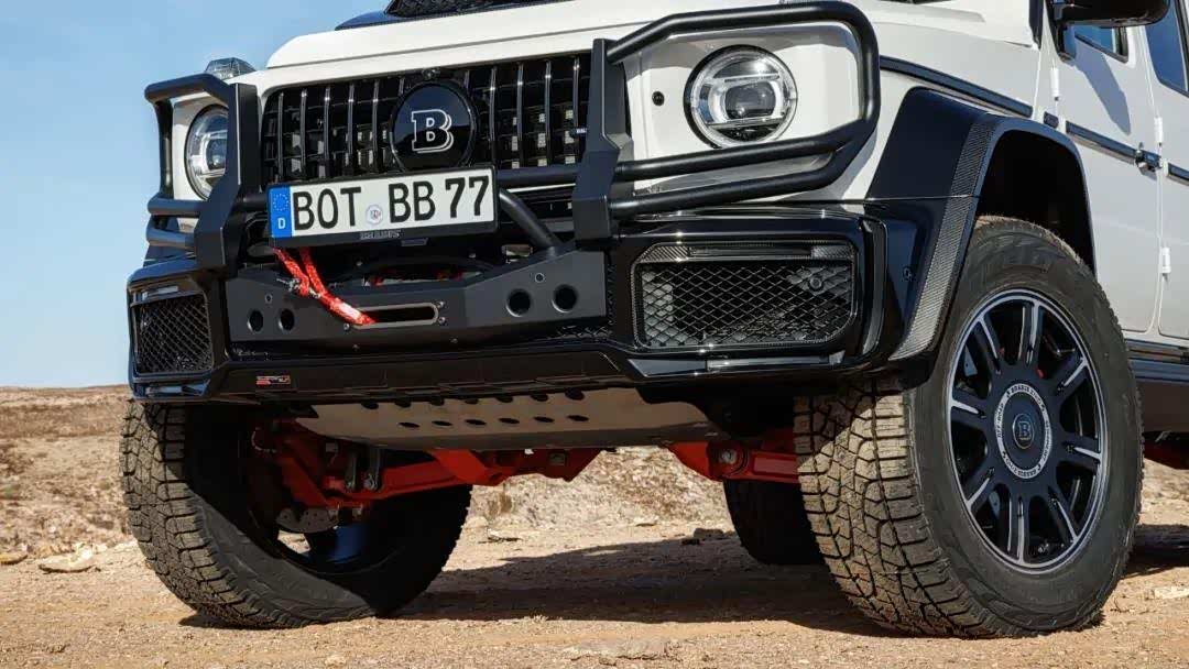 巴博斯对于G63开发的硬核改装部件悉数用上,包括带散热孔的碳纤维引擎盖,金属前护杠,车顶拓展平台,而且加装了行李架。
