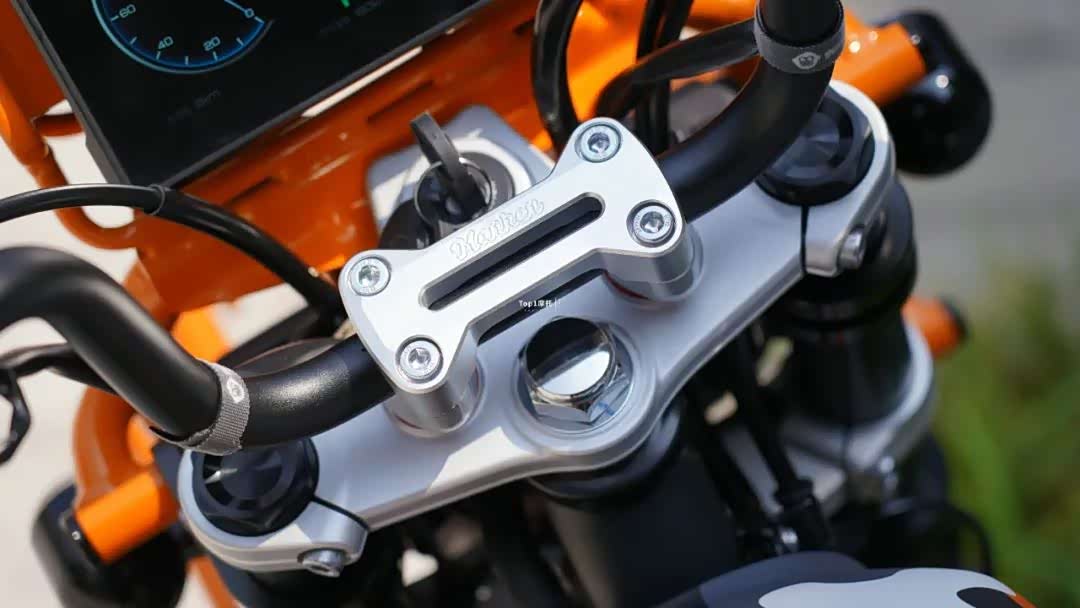 野趣版延续了基本版灵明的高品质用料,不仅采用了锻铝材质和阳极氧化工艺的排档杆/后刹脚踏,而且上下联板同样采用锻铝材质和阳极氧化工艺。另外还有一些CNC材质的运用,包括:后脚踏总成,车头置物架、货架钢管堵头与前减震的抱箍等等。