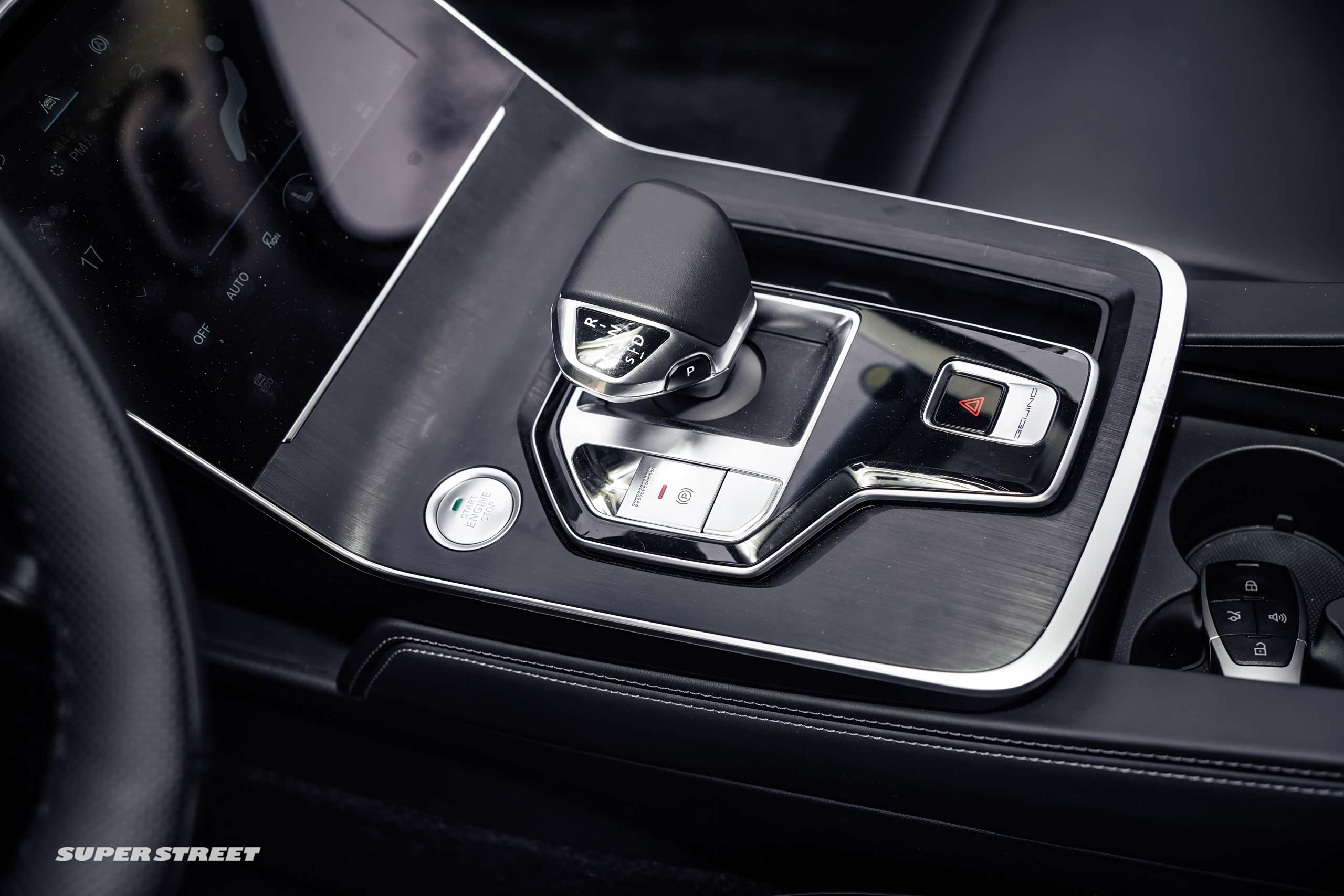 另外,中央区域它是这个电子档把,是配的7速湿式双离合的变速箱,它的中央区域比较简洁,有一键启动、电子驻车和双闪,然后再往下边是一个开放式的中央扶手箱,它有一个移动的杯架,是双层的,并且里面的深度,里面的空间是很大的。