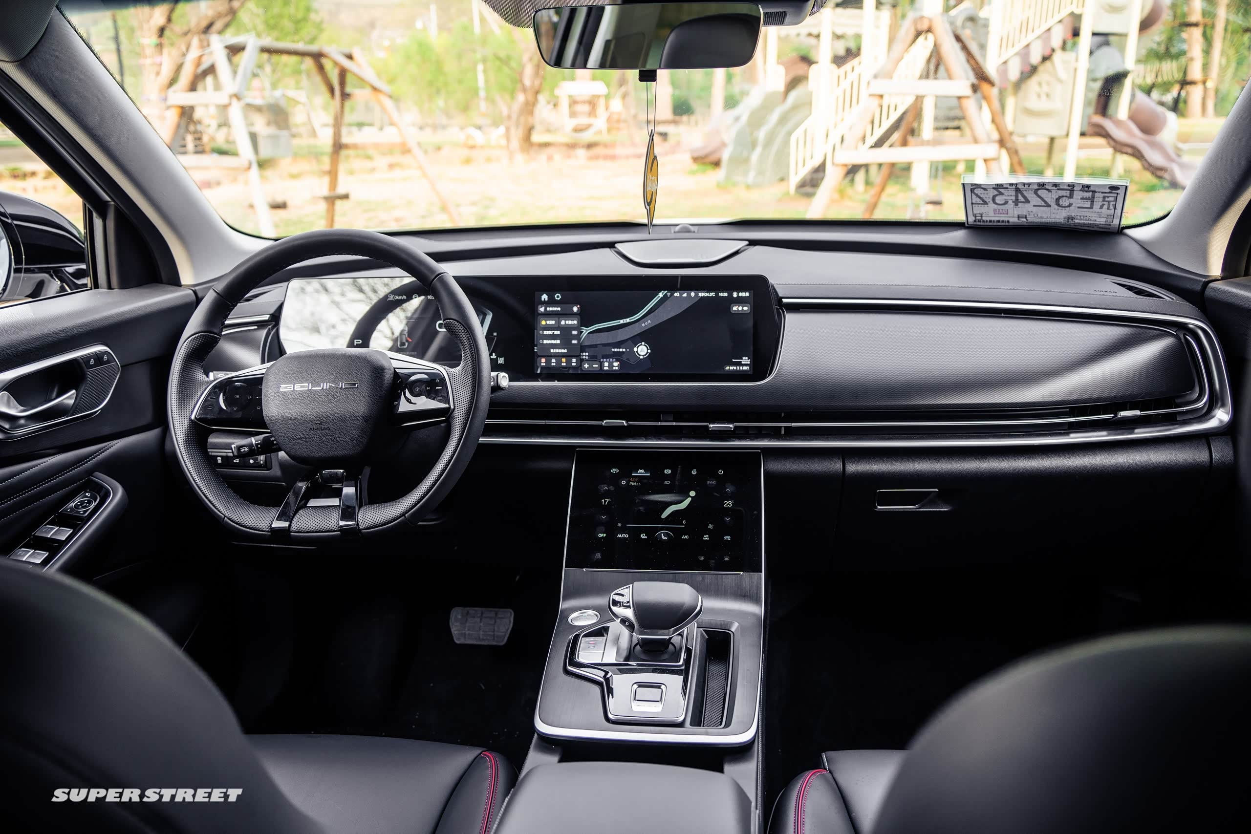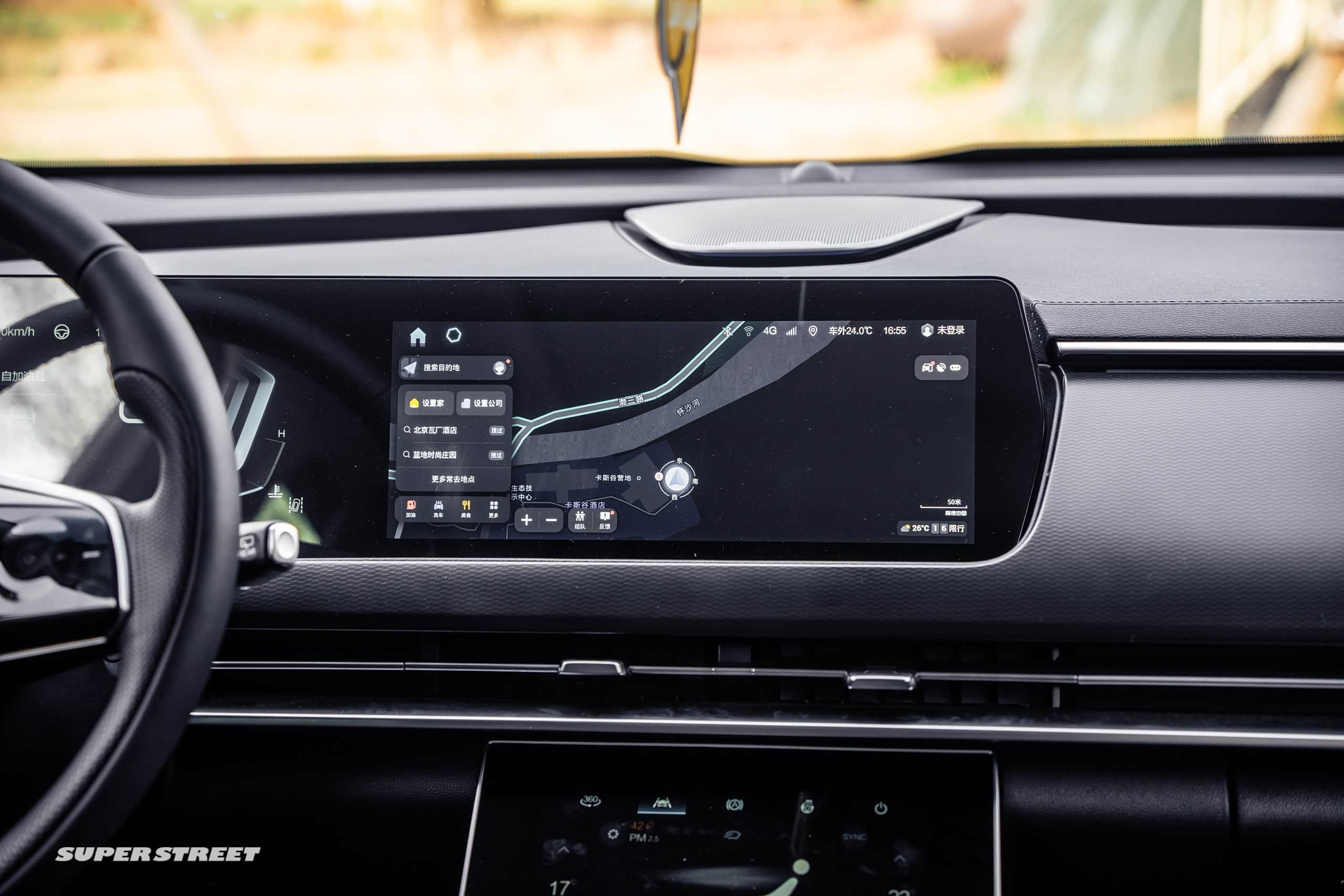 调整好坐姿、调整好方向盘,这个方向盘是可以上下前后调的。对于身高比较高的人比较舒适,我们设一个导航,导航到蓝地时尚庄园,新X7也是用的定制版的高德地图,还是很好用的,因为我手机一直也用的高德地图。
