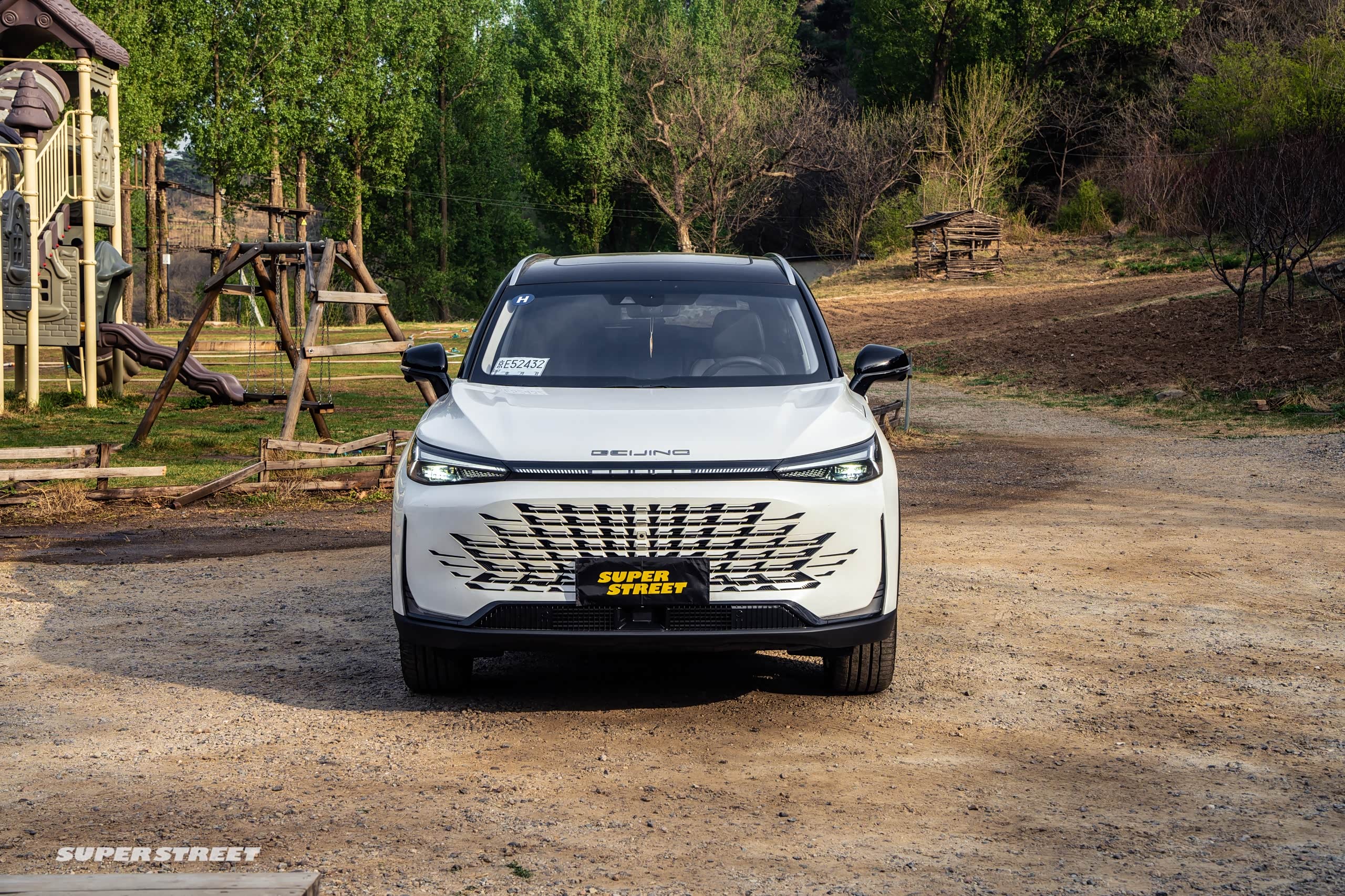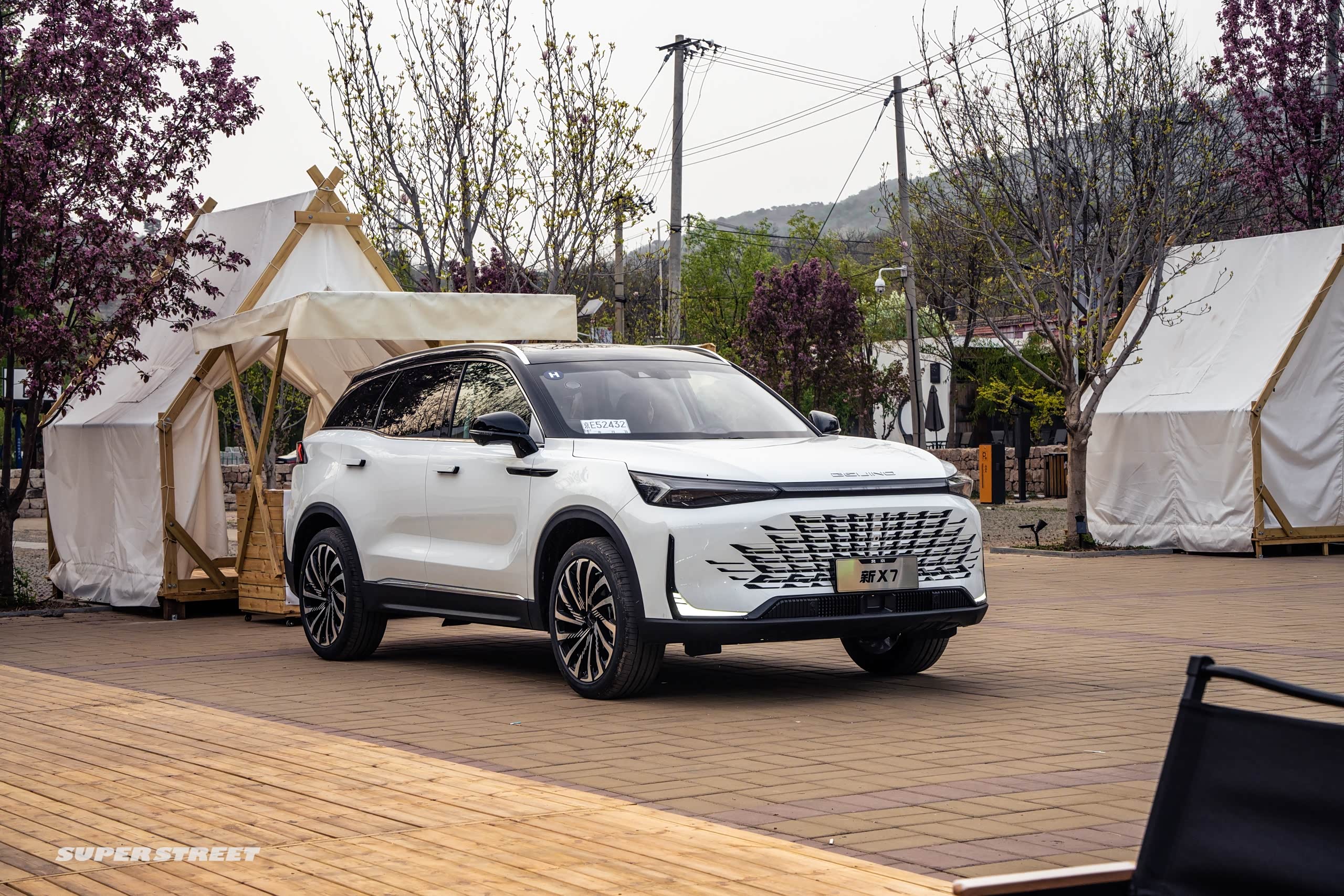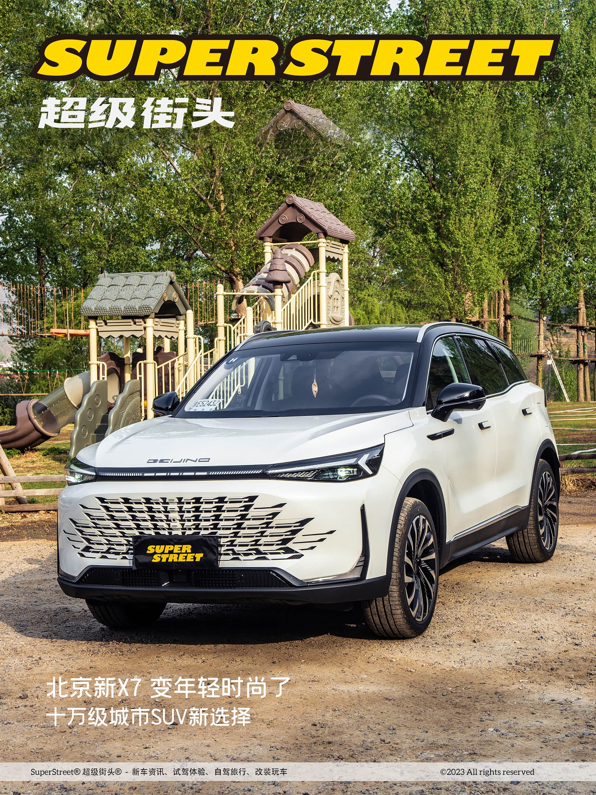 不管怎么样,在周末的时候,我一定是要开车来郊区转一转的,今天呢就开北京新X7,这款车是刚刚上市,大家可能比较陌生,我给大家简单讲一讲,首先它这个前脸是运用了东方美学的设计,它的前格栅是一种麒麟风格的,你看它具体的这种纹理和图案,有没有很像麒麟的鳞片。