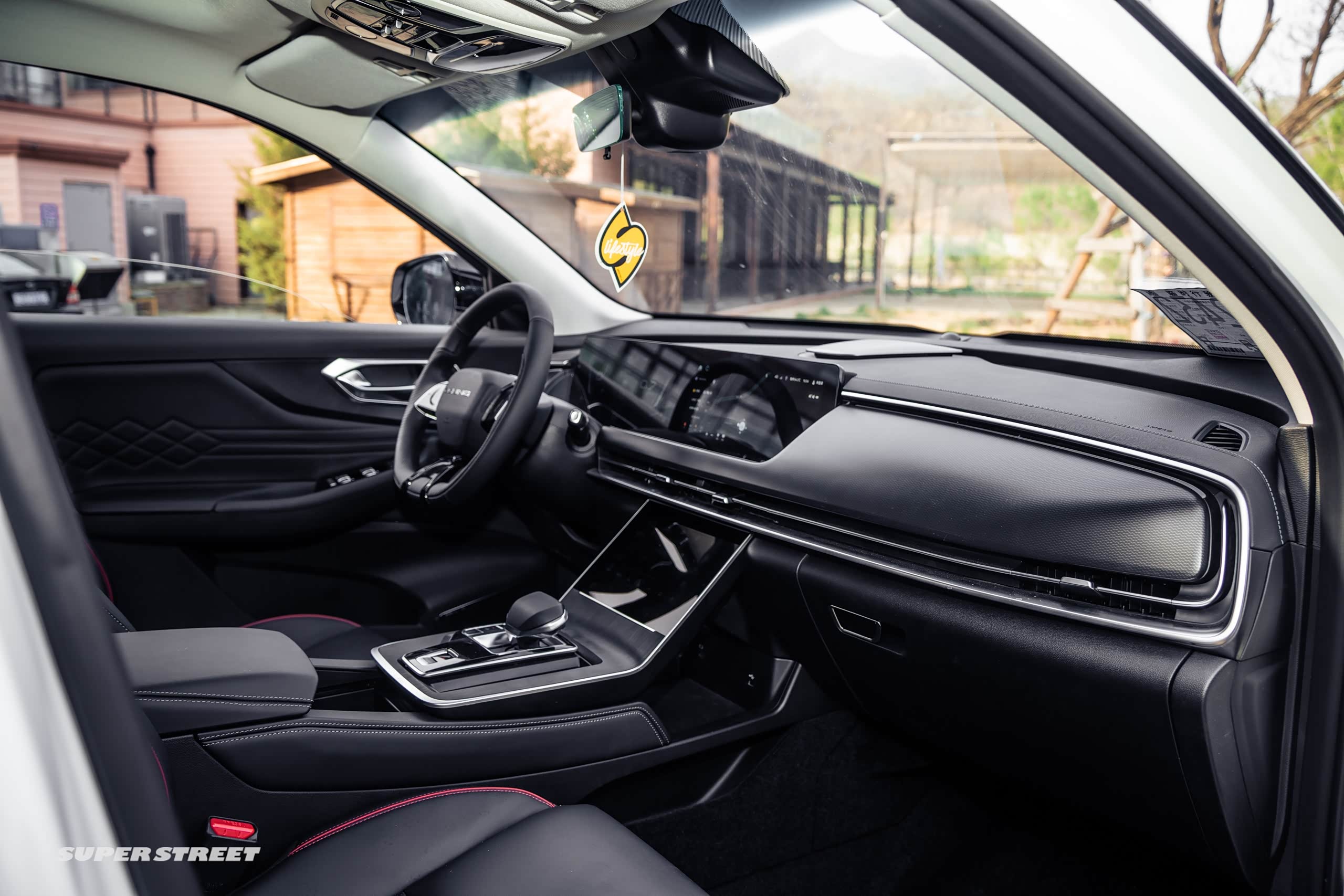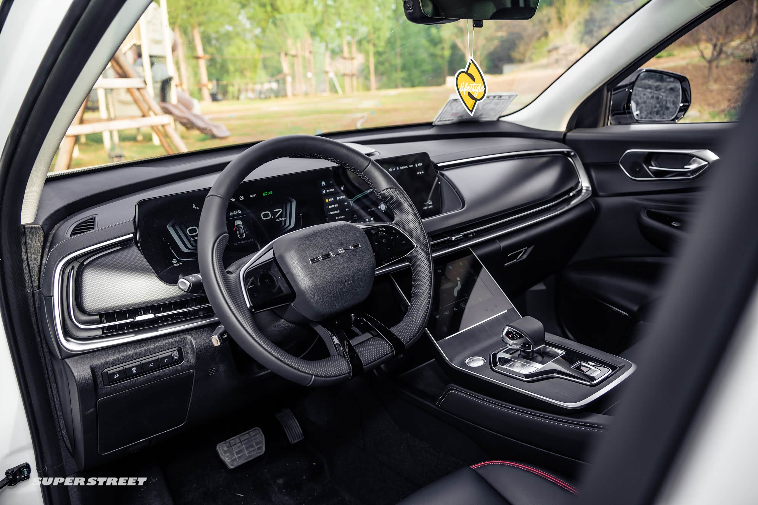 内饰它是一个环抱的形式,仪表盘是两个12.3英寸的双联屏,下面有个8英寸的功能屏;它这个车机系统集成的一些娱乐的应用还是不少的,比如说它有抖音、头条音频,也集成了腾讯的爱趣听,还是很丰富的