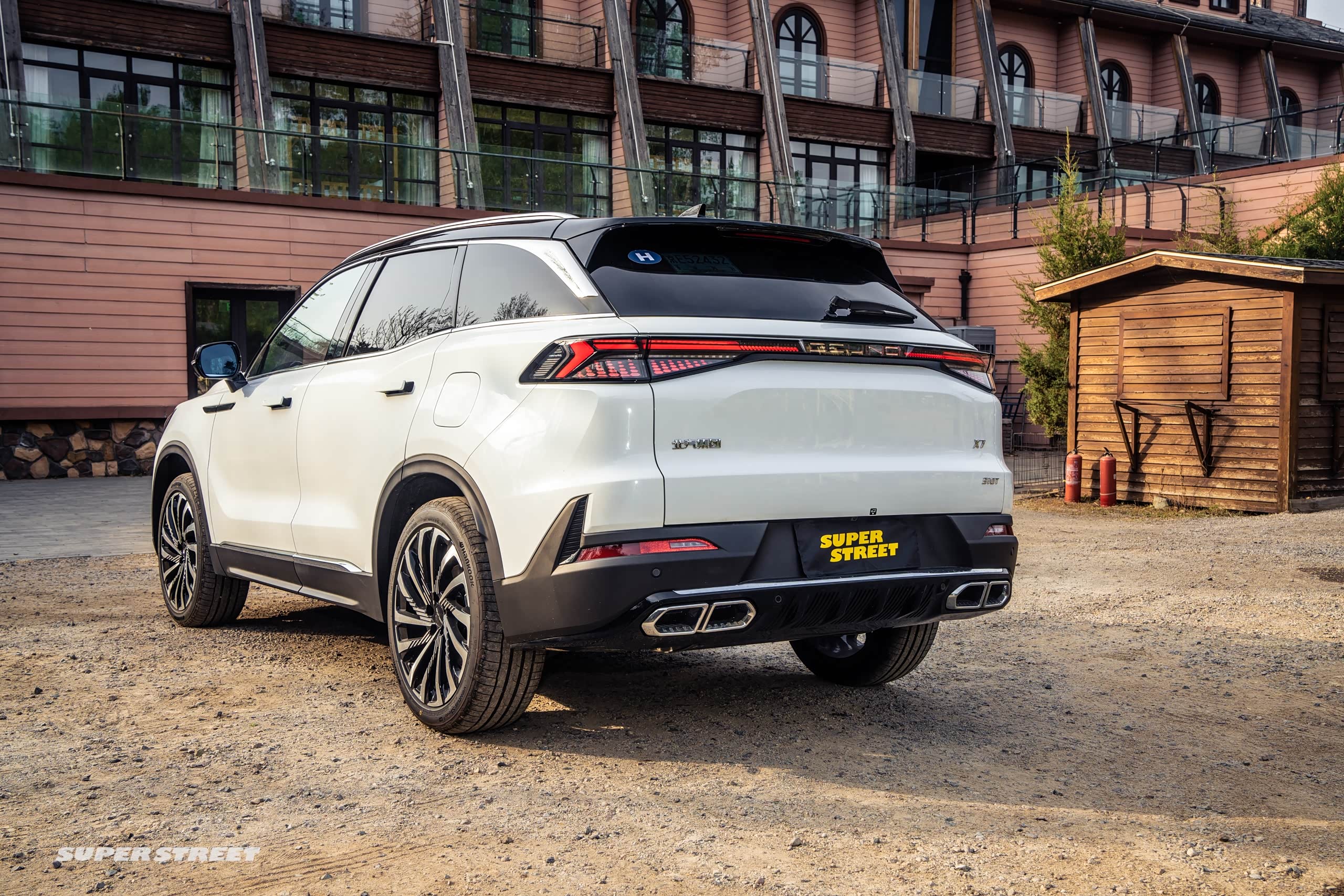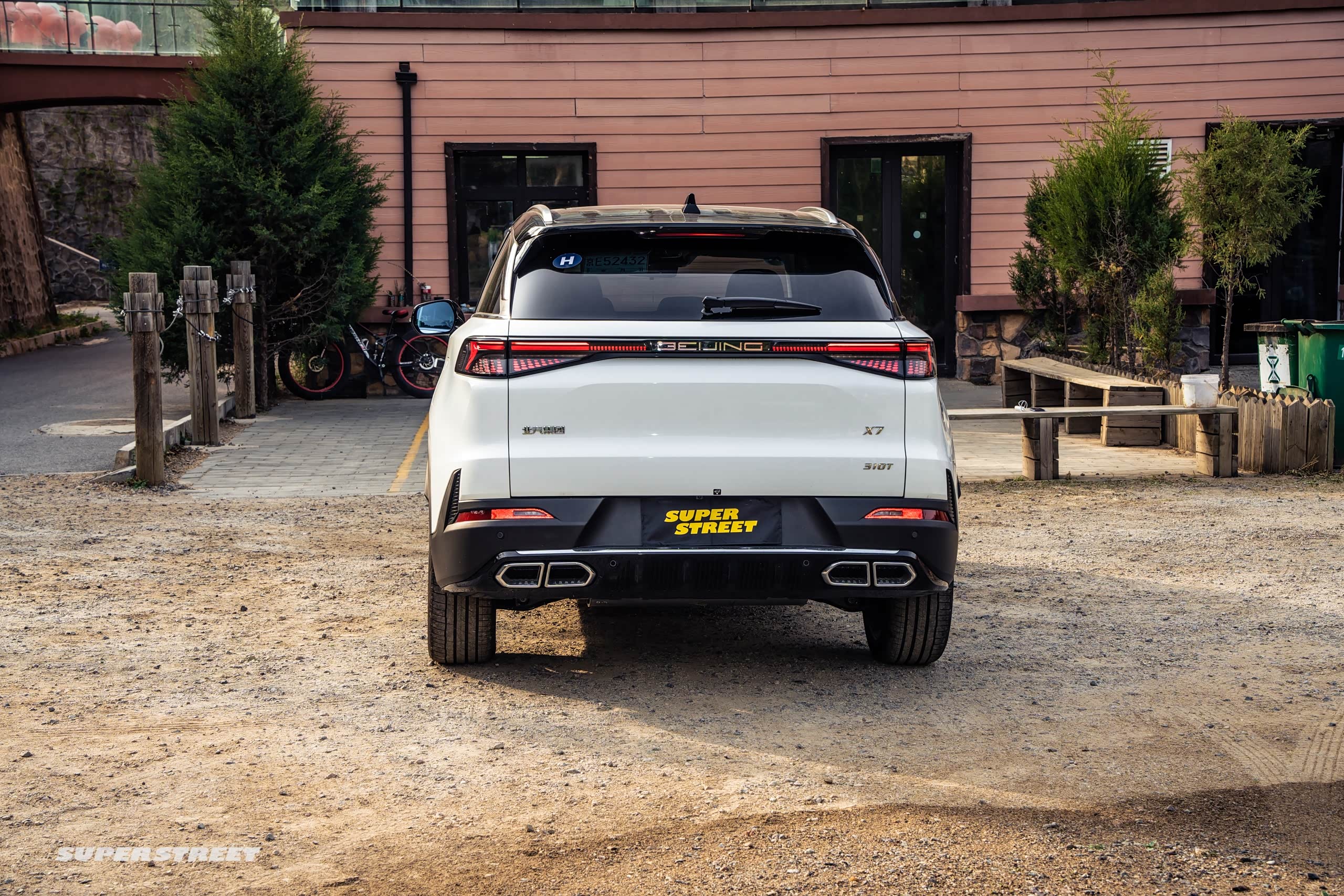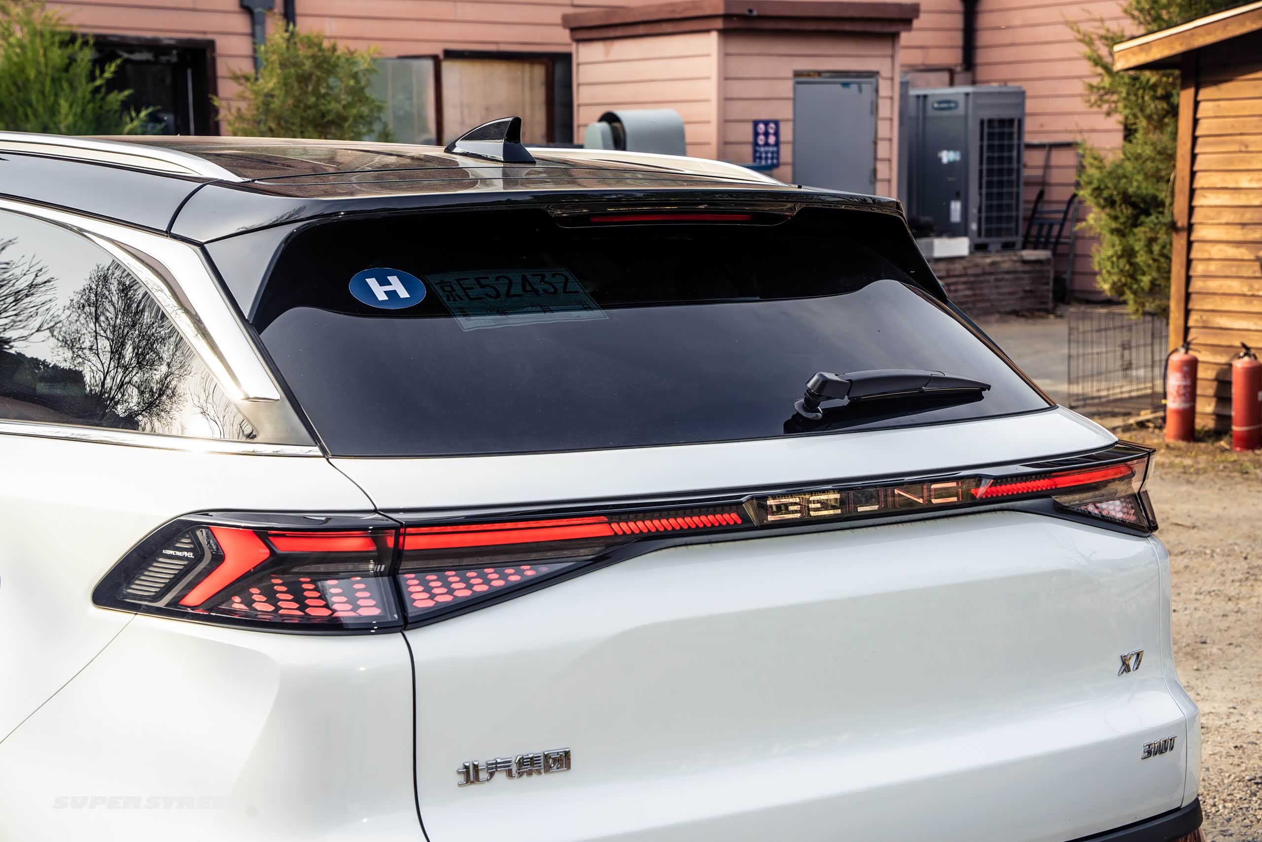 我们现在看一下车的尾部,车尾部其实最大的特点还是它这个贯穿式的车尾灯,北京的这个标志都是可以发光的,在下面看到它是双边四出的尾口,在后期就不用改装了,这样尾口是非常有气势