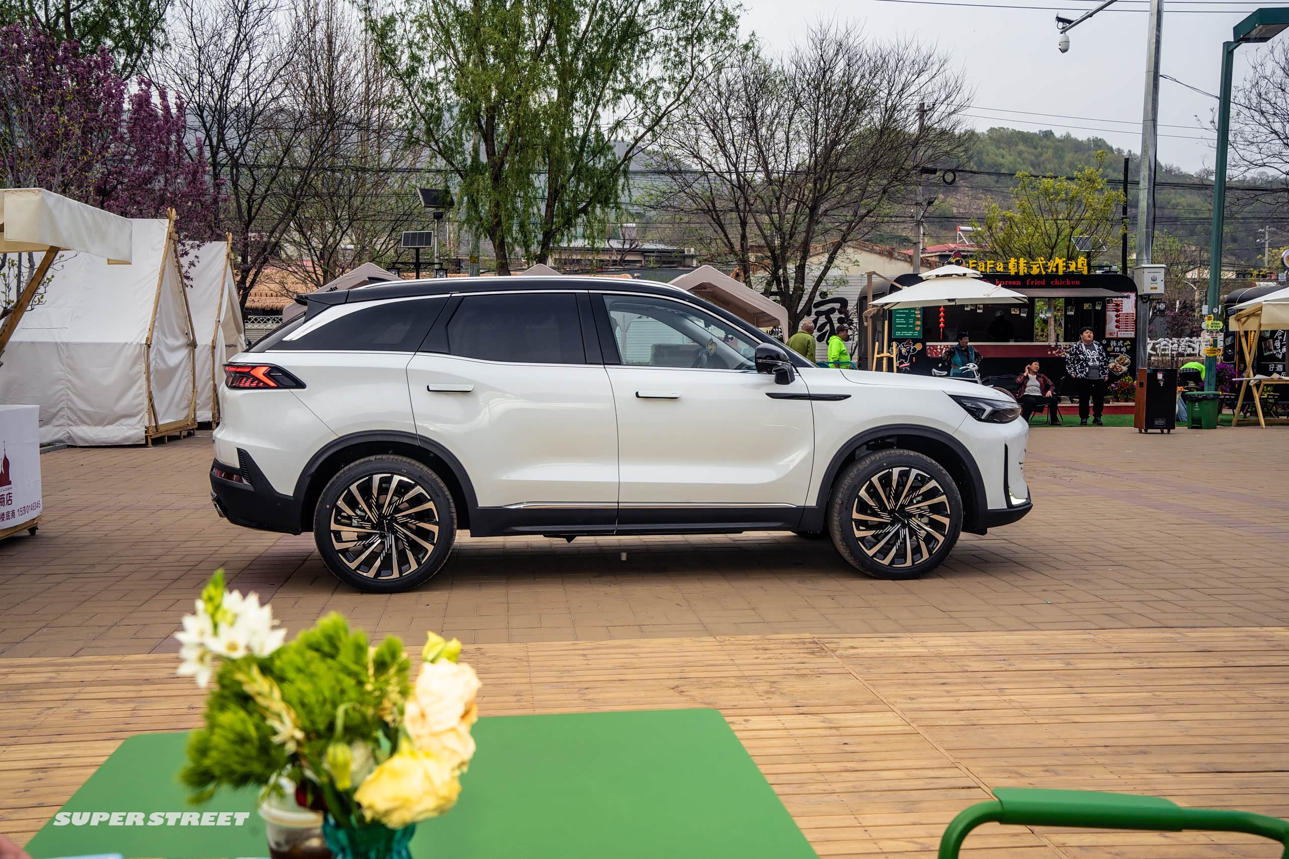 白色的车漆是用的水性漆,还是和巴斯夫和立邦合作,是非常环保的;轮胎也是配的20寸的轮胎,规格是比较大的,另外这个车身尺寸是4745mm、宽是1892mm。