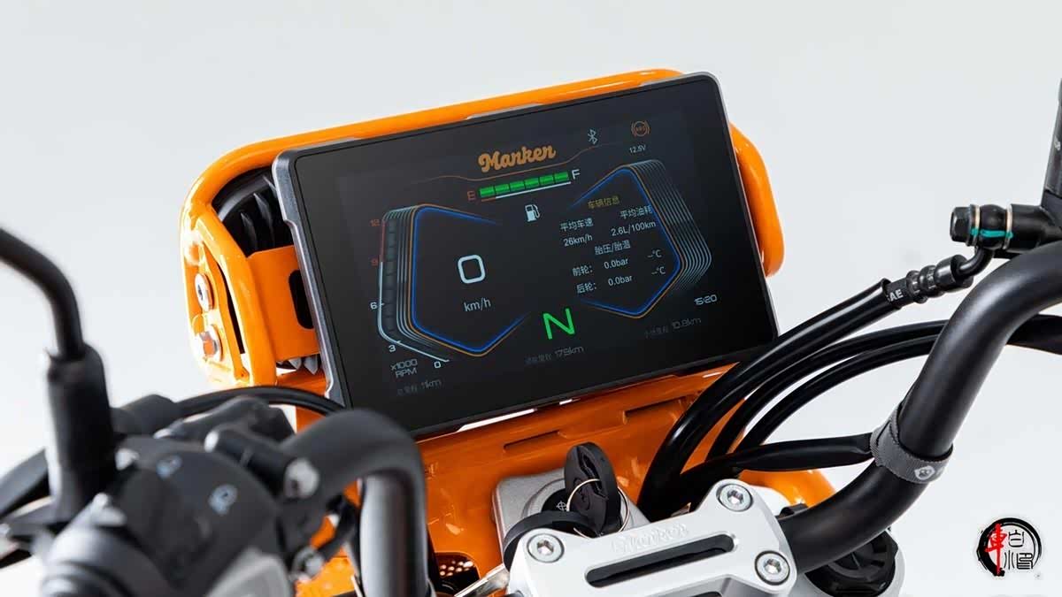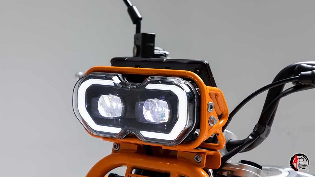 区别于灵明最大的不同除了前后载物支架,便是灯光系统的个性化呈现,灵明采用圆形复古设计,而野趣强化了其趣味性的特征,采用了类似机器人眼睛的设计搭配LED光源,极具趣味和辨识度。仪表也采用了具有蓝牙和导航的全彩液晶显示,尺寸还不小。