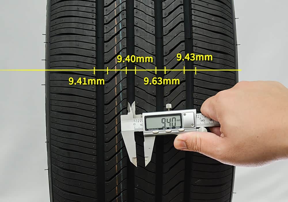 尺寸为235/50R18的韩泰iON ST AS拥有四条纵向沟槽,能够快速排走轮胎表面的积水。实测四条沟槽的宽度都比较均衡,从左至右宽度分别为9.41毫米、9.40毫米、9.63毫米以及9.43毫米。