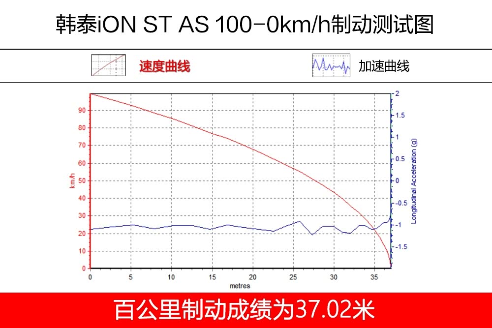 韩泰iON ST AS最短的百公里制动距离为37.02米,整体制动效果比较好,制动距离发挥比较稳定,ABS工作时机较晚,维持在37-38米之间,即便连续多次制动,也不会有发生任何的制动衰减的问题。
