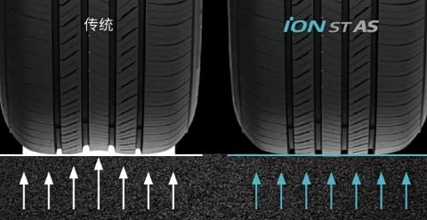 作为一款舒适的轮胎,iON ST AS的花纹设计更加注重降噪设计。比如胎肩横向沟槽向肩部进行弯曲且变得更宽,让轮胎接地瞬间,降低类似抽泵式的噪音。