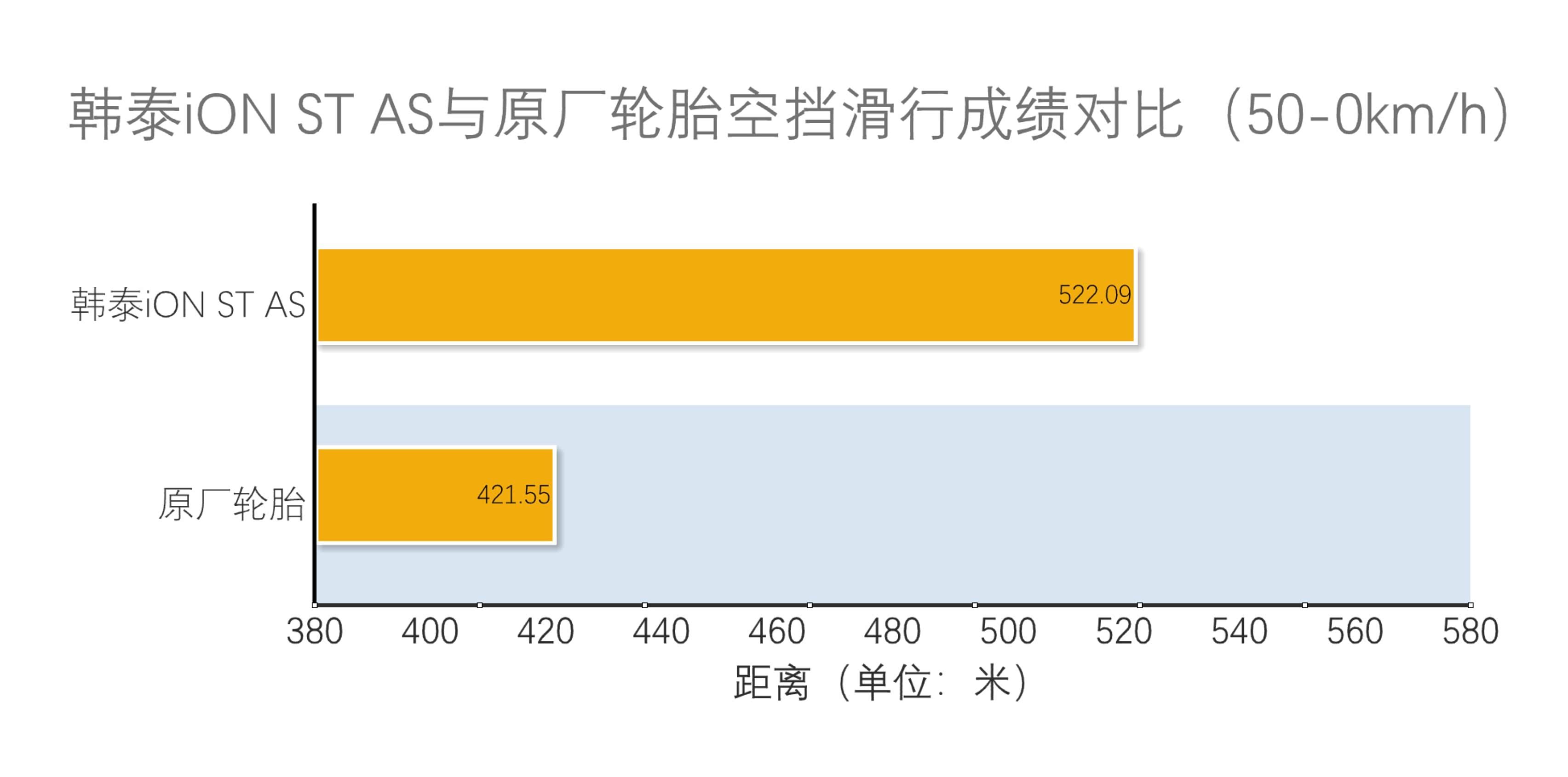 根据我们以往测试的经验来说,50-0km/h的滑行距离一般在300-480米这个区间,根据不同车型且有不同的表现,超过400米均是低滚阻轮胎的水平。