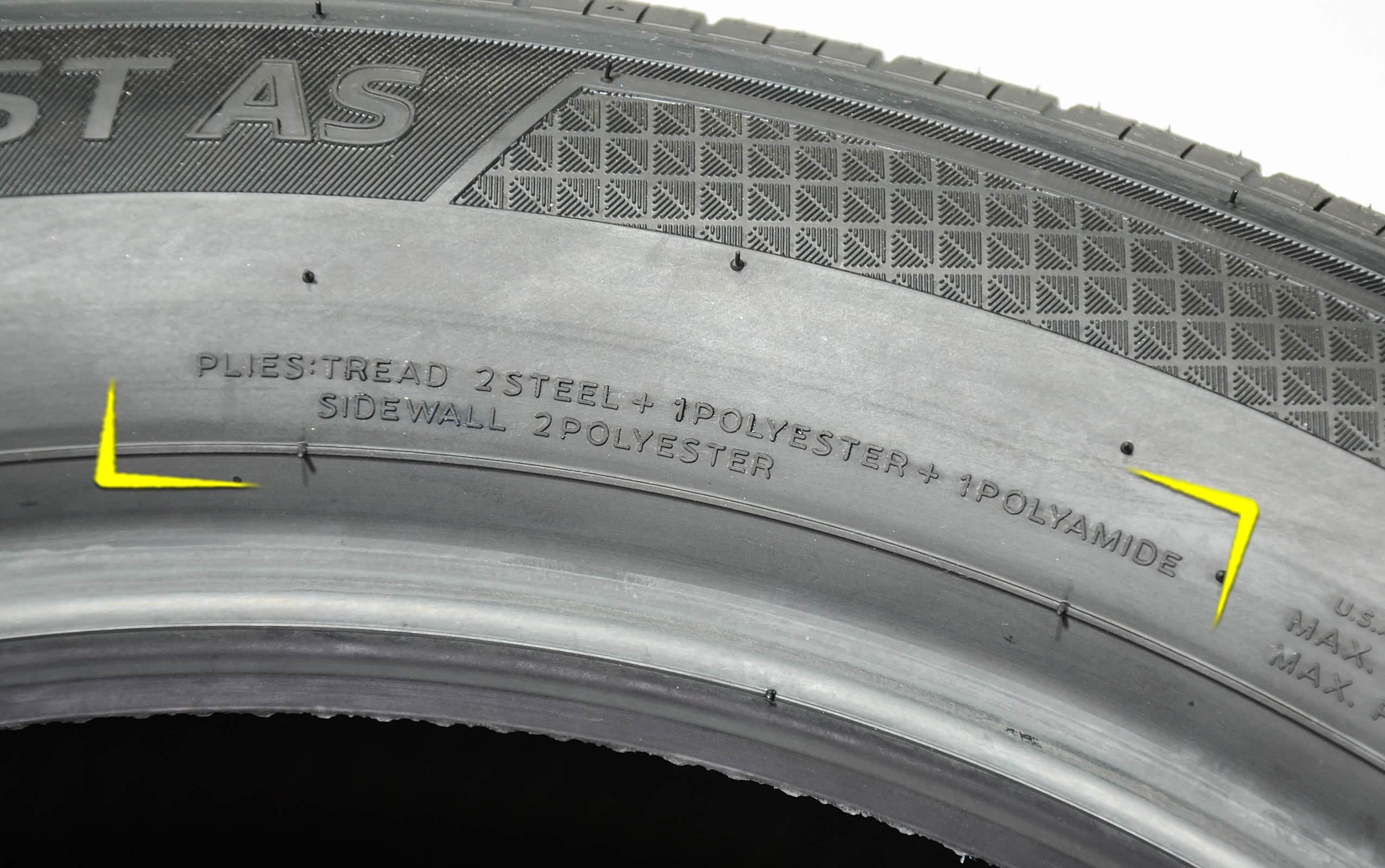 轮胎层数,韩泰iON ST AS并没有进行特别加厚处理,胎冠只有4层的结构,1层聚酯、2层钢丝、1层尼龙;胎侧为2层聚酯。