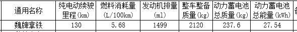 电池上,其搭载的是蜂巢的磷酸铁锂电池,目前工信部公布的电池容量就为27.54kWh,带来的WLTC标准下纯电续航为130km,目前工信部只公布了这个电池容量版本,参考新款魏牌摩卡只推出了一个配置版本,新款拿铁也有不小的概率只有这个WLTC标准下纯电续航130km版本,这纯电续航比起在售的拿铁DHT-PHEV是下降了不少的(在售款WLTC纯电续航是184km)。馈电油耗上,工信部公布的就是百公里5.68L。