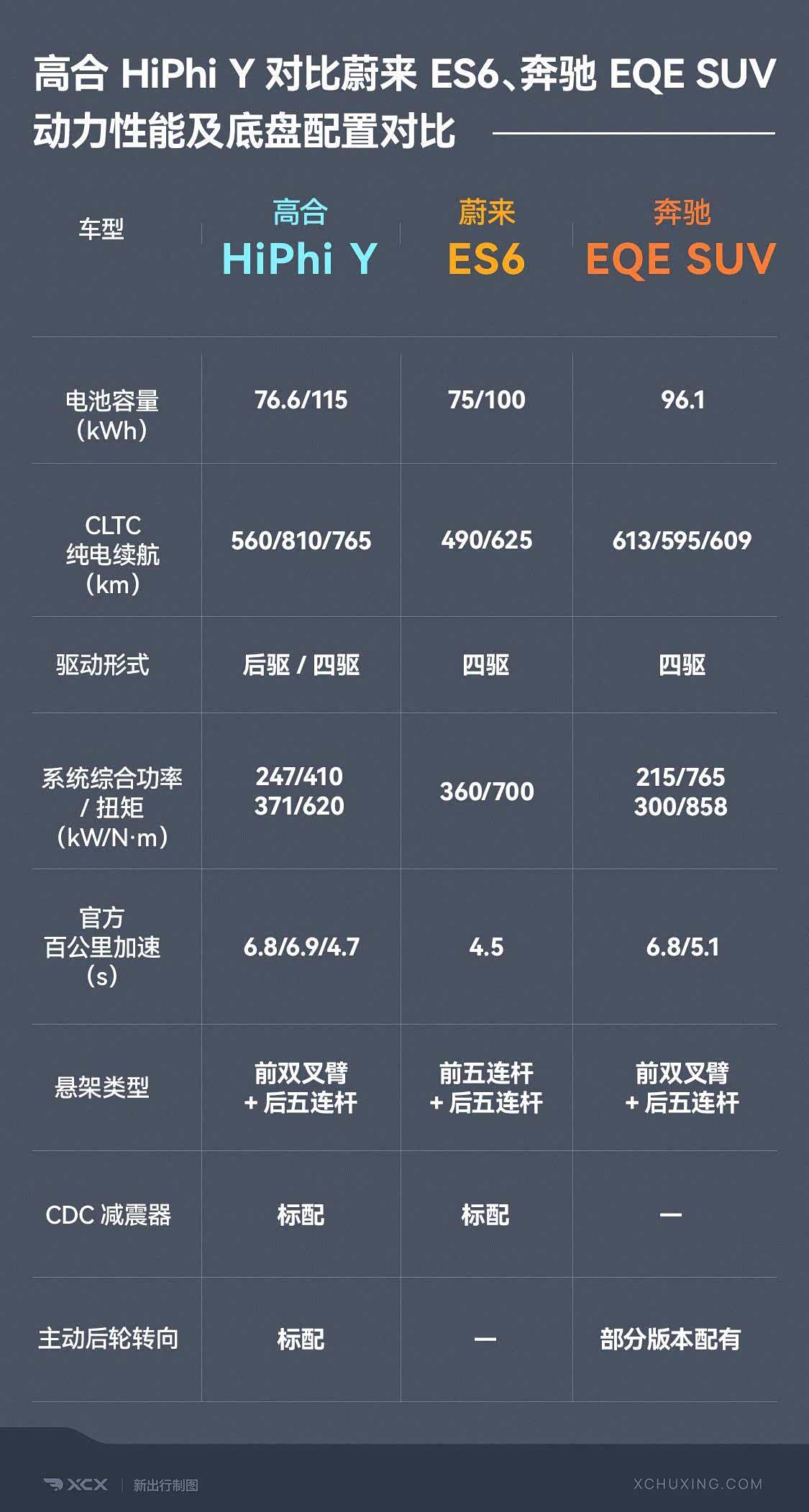 从对比图能够看出,高合 HiPhi Y 采用的是比较全面的解决方案,提供了两驱和四驱,标续和长续航多种选择方案,能够最大满足消费者的选择需求。想要续航长点,有;动力充沛的,有;日常代步的标续版,也有。