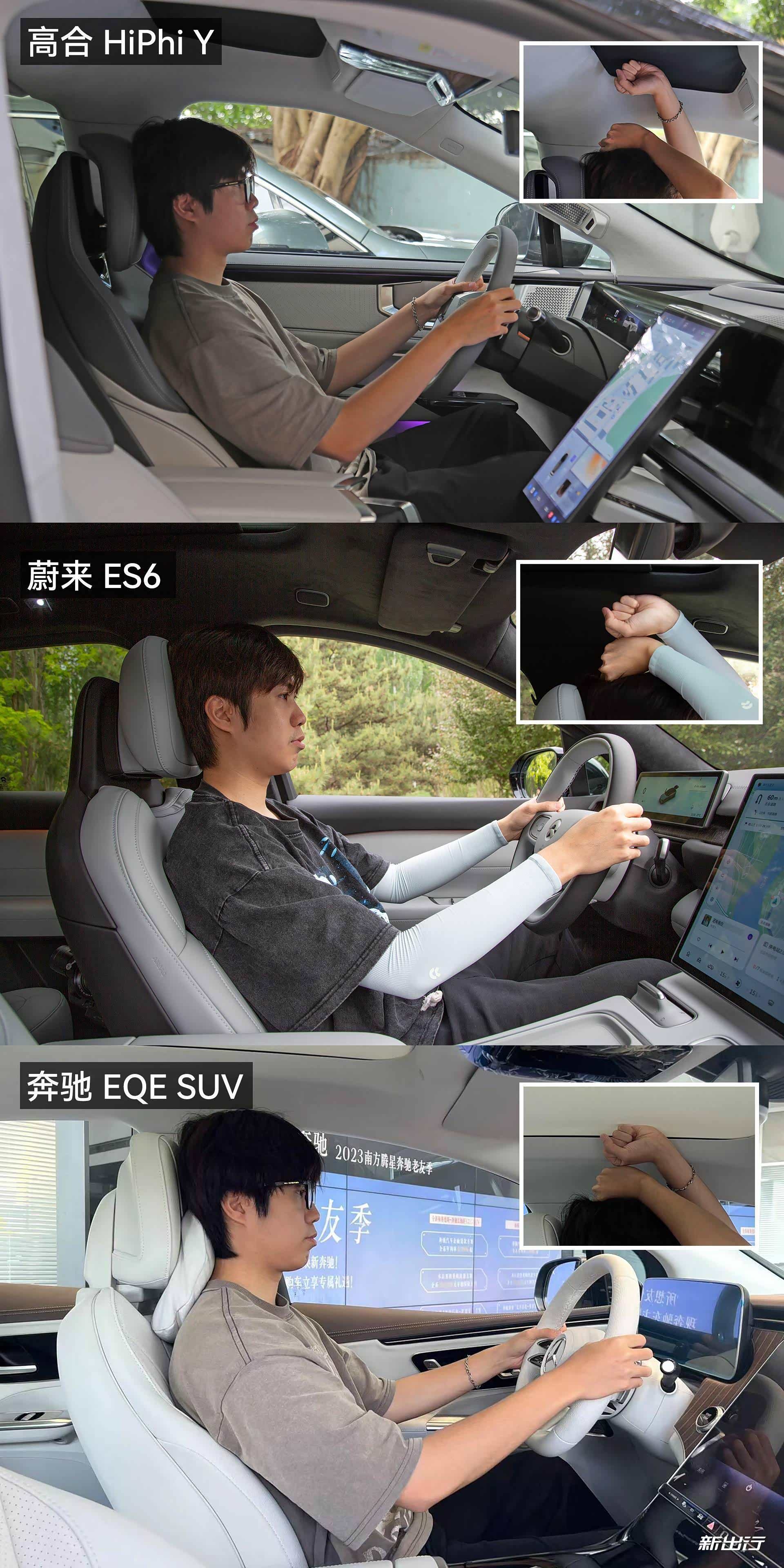 我们在将主驾座椅调节至最低且前后合适的位置, 此时高合 HiPhi Y 头部空间为两拳富余,蔚来 ES6 头部空间为两拳,奔驰 EQE SUV 头部空间为两拳。
