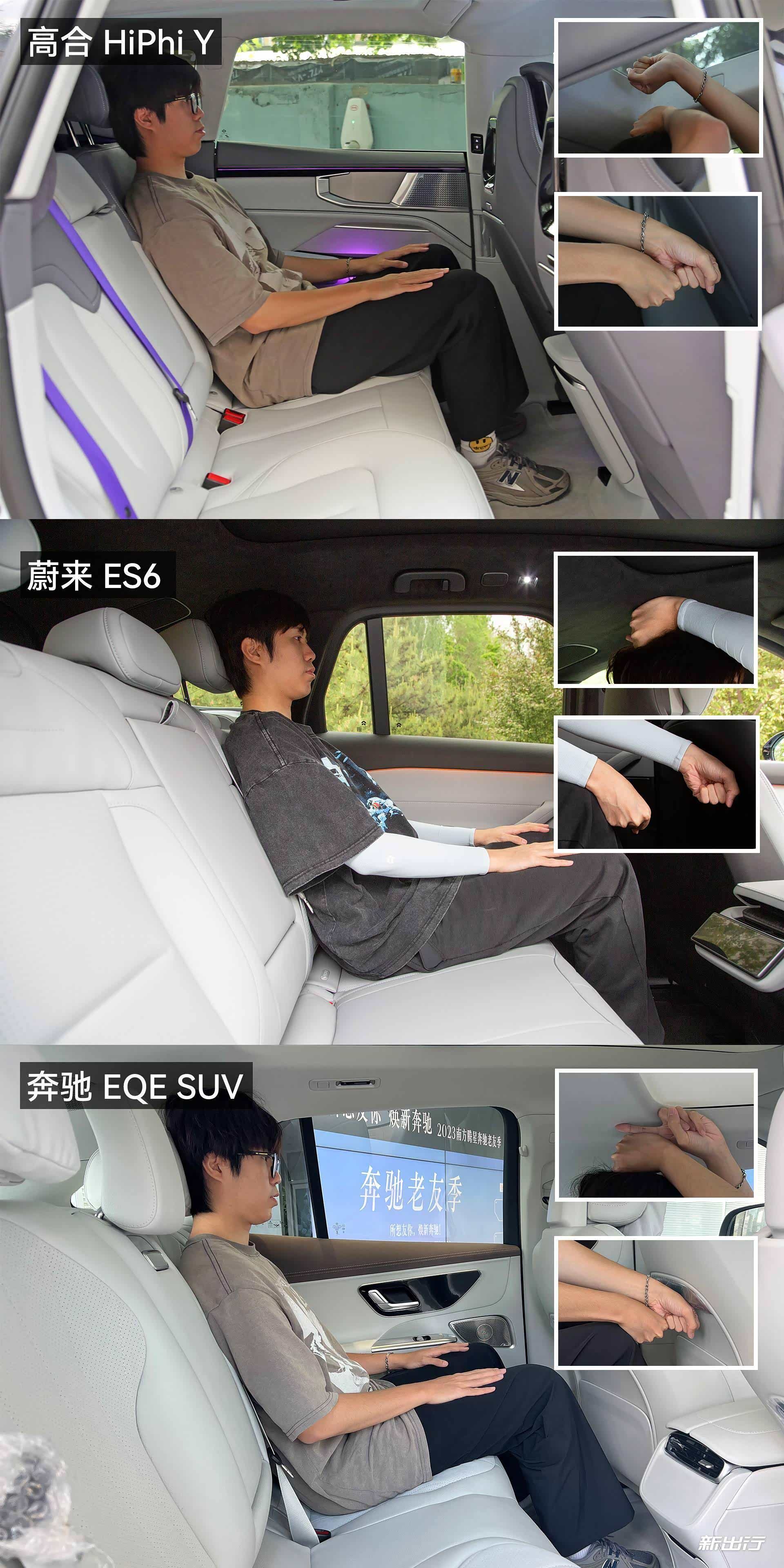 保证前排座椅不动,去到后排,此时高合 HiPhi Y 头部空间同样为两拳富余,腿部空间为两拳。蔚来 ES6 头部空间为一拳,腿部空间为两拳富余。而奔驰 EQE SUV 头部空间为一拳一指,腿部空间为两拳。
