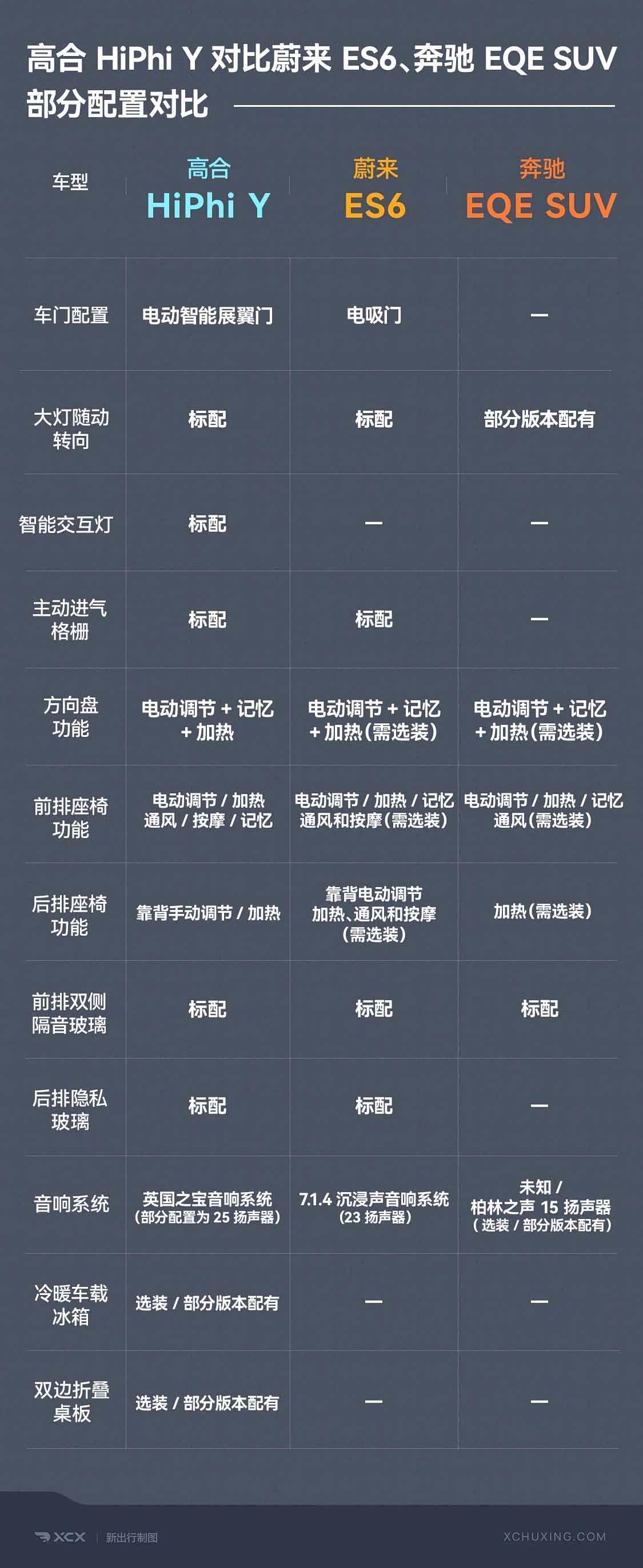 那么通过差异配置对比图来看,显然高合 HiPhi Y 在配置上会比其他两款车型拉的更满一些,包括一些新颖的配置,比如自动展翼门、智能交互灯、冷暖智能冰箱,以及 HiPhi Y 独有的 HiPhi Port拓展坞,可悬挂平板电脑、投影仪等。